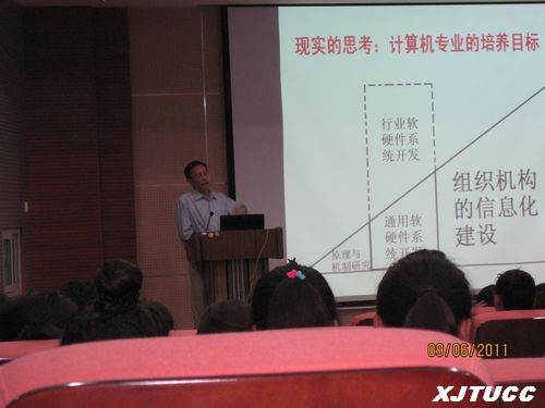 9月6日晚7点在F100会议室,系主任陆丽娜老师、系副主任李联宁老师为11级新生开展了计算机专业认知教育。首先,李联宁老师分别为新生介绍了计算机的专业设置、专业方向及专业培养目标,期间用一个典型的“开车、修车、设计汽车”为案例,向大家类比了计算机专业人才的不同发展方向。随后,陆丽娜老师对新生四年的学习重点和目标逐一进行了明确。最后,10级学生代表和同学们共同分享了自己一年来的学习心得。
