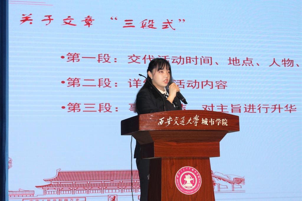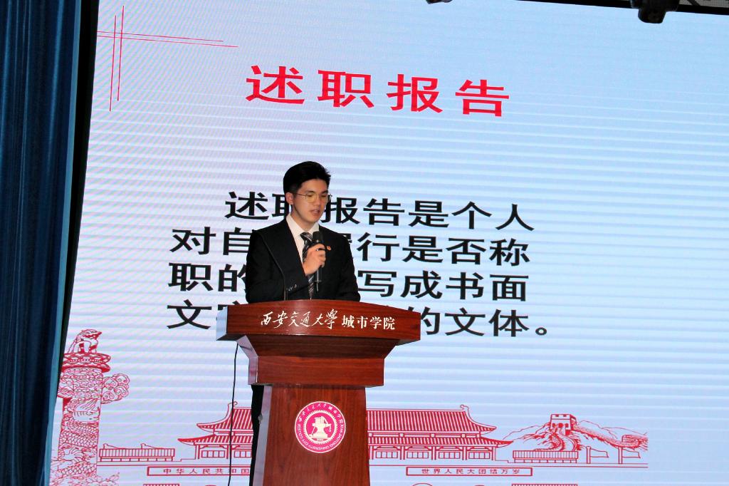 之后是由各位团学组织代表进行的对团学工作的分享与经验交流。第一个分享的是学生会主席陆一洲同学,他分别从通知、工作总结和计划、策划案、述职报告等四个方面进行介绍,最后通过案例的实操来向大家展示在日常工作中可能出现的问题,随后是由团委宣传部常务副部长马麒淇同学为大家讲解了新闻稿、拍照与推送这几个板块,使得在场的团学干部更加直观的了解了宣传工作相关内容。紧接着,团委组织部常务副部长李炳成同学就基础团务工作规范为大家进行讲述,对共青团性质、职能,共青团标志与共青团基层组织主要任务等方面进行详细的介绍。同时为我们讲解了发展团员的标准与入团流程,并针对团学干部对共青团的疑问进行了解答。第四个由陈佳旭同学讲述了她在参加陕西省第一届团干部能力素质大赛的经历,在大赛过程中,她认识了许多优秀的选手,也坚定了不断提高自身能力,学习各方面知识,做一名有思想、有本领、有担当的团干部的决心。最后,由团委社团工作部常务副部长刘阳兰兰同学分享了她的工作经验,她讲道,团学干部应该发挥新时代青年的模范作用,做好承上启下的工作,深入基层,了解实际,把握学校整体工作方针,承接老师的各项工作,培养自身爱国信念,将爱国精神践行在生活中,同时要培养不屈不挠的工作精神,仔细筹划和组织,积极总结经验和不足,对工作有充分的责任感。