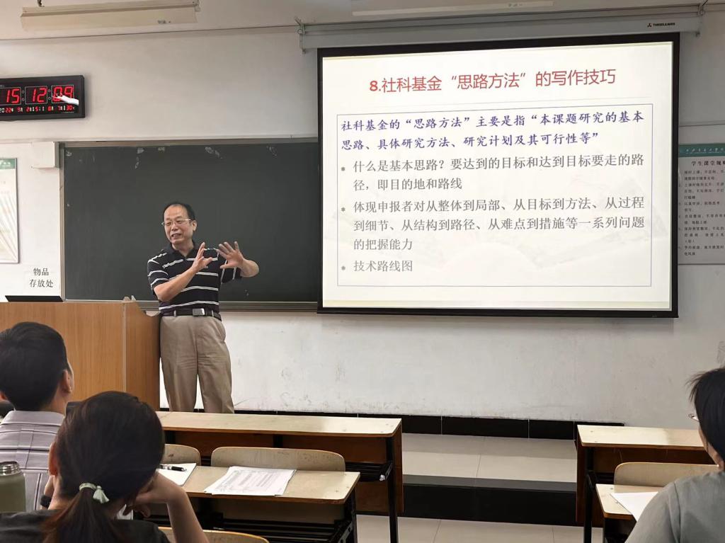 “社科基金申报应注意的10个问题”专题讲座(上)举办后,老师们反响热烈,收获颇丰。李明德教授继上次讲座后,本次围绕选题的“三结合”和“三字诀”、怎样写好社科基金文献综述、社科基金的独到价值该如何写、社科基金的研究内容怎么写才会更出彩、社科基金“思路方法”的写作技巧、社科基金的创新之处及其他关键点、国家社科申报书专家意见汇总等7个后续问题展开学术探讨。