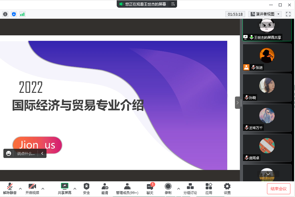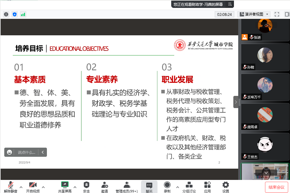为加快2022级新生角色转变,强化专业认知,明确学习目标,西安交通大学城市学院经济系于9月4日线上开展了2022级新生入学教育之专业认知教育。本次会议特邀学院人事服务中心国际合作与交流办公室孙晓。经济系副主任杨健全、主任助理廉宇婷、金融学专业负责人李茂盛、国际经济与贸易专业负责人王世杰、财政学教师冯茜、新生辅导员张进出席了本次会议。此次会议由张进主持。