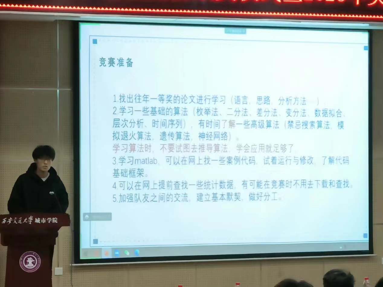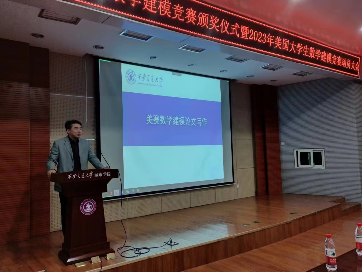 2023年美国大学生数学建模竞赛即将举行。为了鼓舞广大参赛队员取得佳绩,学院副院长朱旭教授为赛事做了赛前动员,并分享自己多年以来指导建模竞赛的宝贵经验。朱副院长对各位指导老师在数学建模竞赛方面所做的工作、辛勤付出和取得成绩表示肯定,同时,强调了数学建模的重要性,希望各位同学积极参与建模,激发自主学习和创新精神,在竞赛中展现自我,脱颖而出,收获荣誉、知识与快乐。