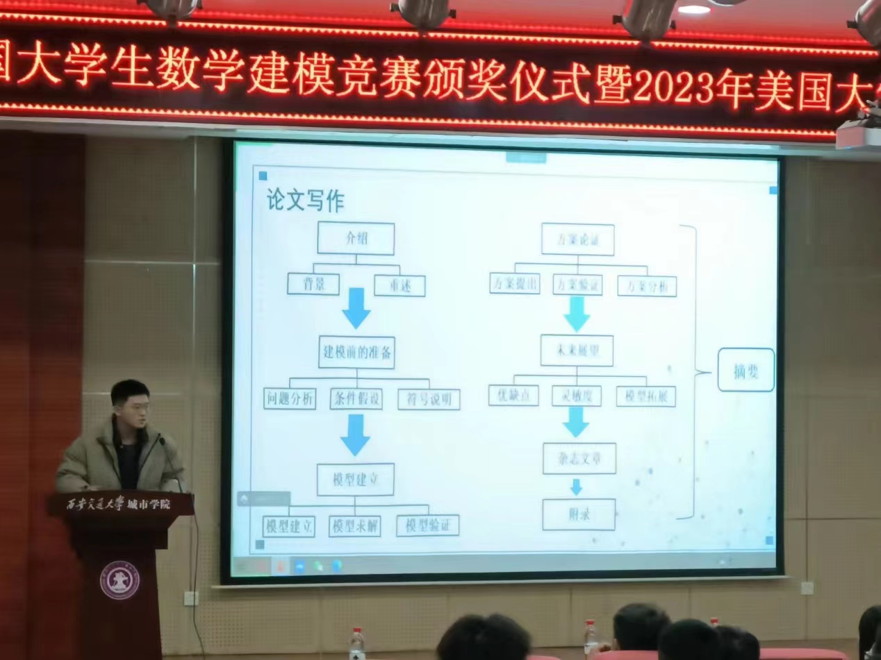 大会首先由茹静书记宣读了2022年度数学建模竞赛获奖名单,与会领导分别为获奖学生颁发获奖证书,并对获奖学生表示祝贺。之后,获奖学生代表分享了自己的参赛历程与竞赛经验。