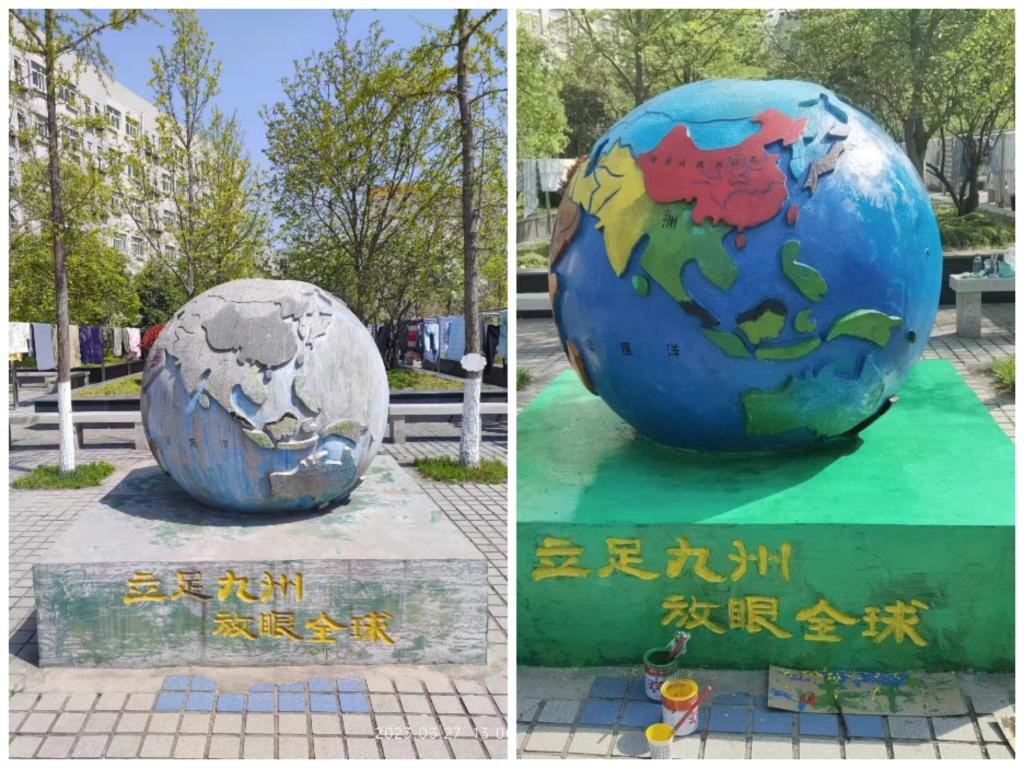 本次活动中,艺术系学生充分发挥专业特色,发挥自身专业特长,对静立在长廊的地球仪模型进行修复。在同学们为期2天的清扫、打底、晾干、铺色、调色、补色等系列工序中,地球仪模型重新焕发光亮的色彩,也为美化校园环境做出了小小的贡献。