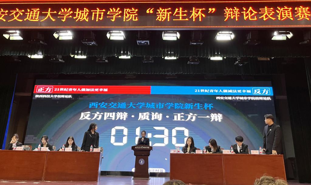 参加本次辩论赛的正方为陕西科技大学校辩论队,反方为西安交通大学城市学院校辩论队。双方就“21世纪青年人做加法/减法更幸福”展开激烈的辩论。一方从容自若,口若悬河,另一方却也气定神闲,滔滔不绝,双方辩手层层推进。比赛结束后,现场同学踊跃发言,将自己的想法和问题提出,展现了新生们自己对于本场辩论比赛的思考,场上的同学也给予了完整的回答,使许多新生对这个辩题有了更深入的思考和更多方面的理解。