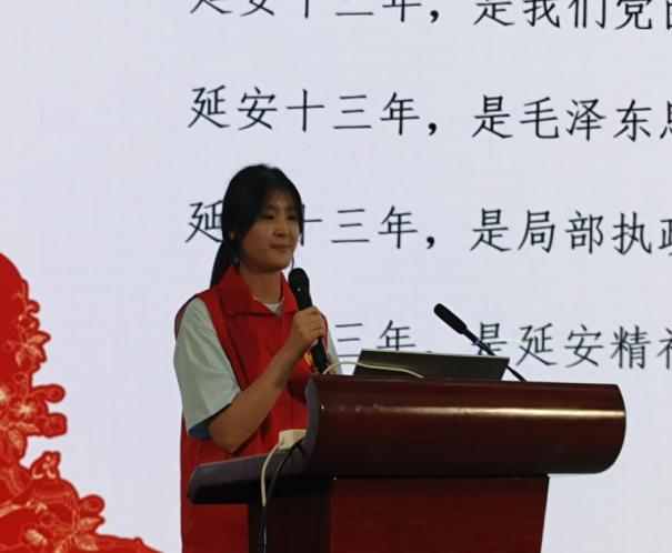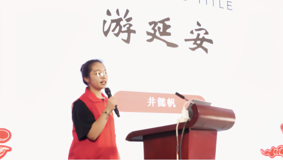 “延安精神”宣讲团成员井懿帆同学以生动的语言和丰富的历史素材,带领师生们“游延安”,重温了那段艰苦卓绝的革命岁月。杨舒迪同学深入解读了延安精神的内涵。