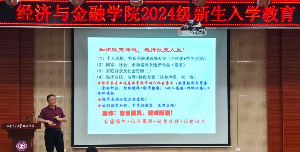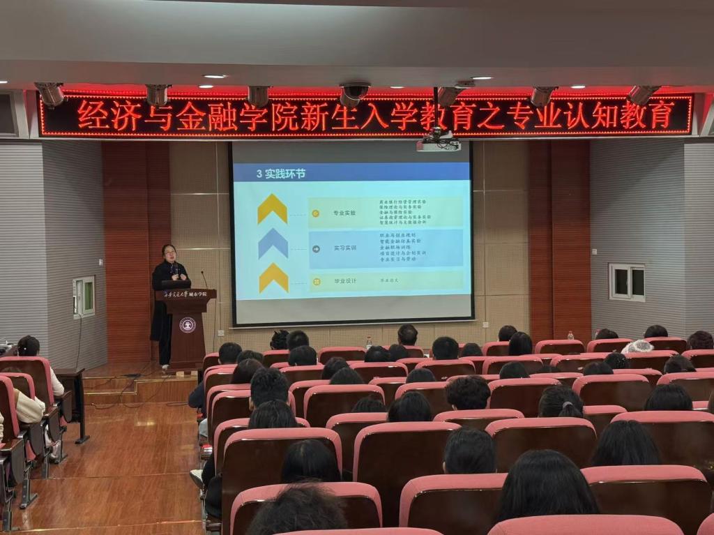 为帮助2024级新生更好地了解专业发展前景,明确职业目标,科学规划大学生活及未来职业生涯,经济与金融学院于9月25日在F100召开2024级新生入学教育之学业与职业规划,本次会议由经济与金融学院副院长杨健全教授主讲,辅导员杨静怡及2024级全体新生参加。