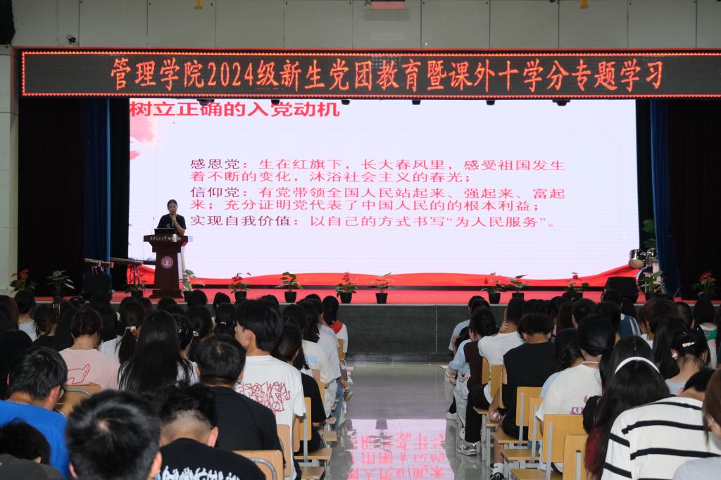 为了进一步提高管理学院2024级新生的思想政治教育水平,加深新生们对党团知识的了解,引导新生积极参与课外活动,充实大学生活,提升学生的党团意识和综合素质。管理学院于9月19日在大学生活动中心成功举办以“坚定理想信念,担当新时代使命”为主题的2024级新生党团教育暨课外十学分专题学习会。出席本次活动的有管理学院学生第二党支部书记李璐、团工委书记柯智航、学生代表尚钰萌。