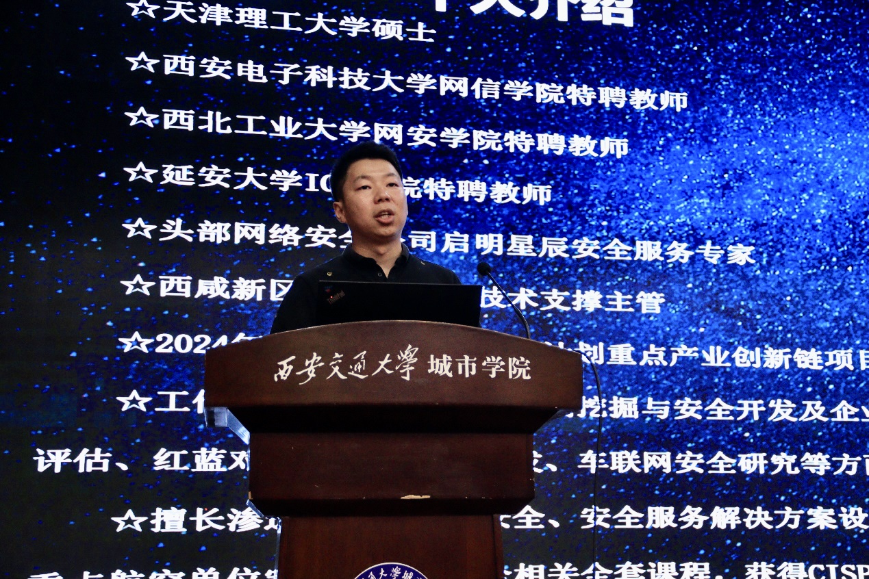 西安启明星辰安全服务专家张启超以“黑客从0到1”为主题,就网络安全方面对大一新生进行了认知教育。他主要介绍了作为合格安全工程师所需具备的基本技能,并通过具体的案例演示让同学们对网络安全有了更深入的理解。