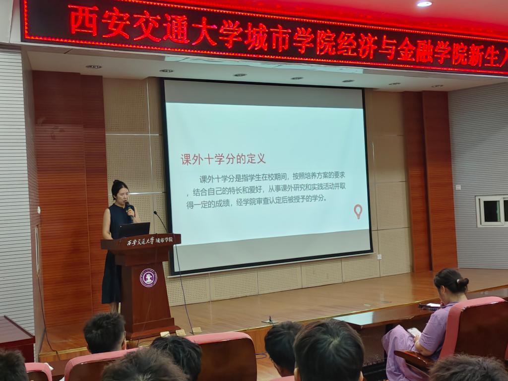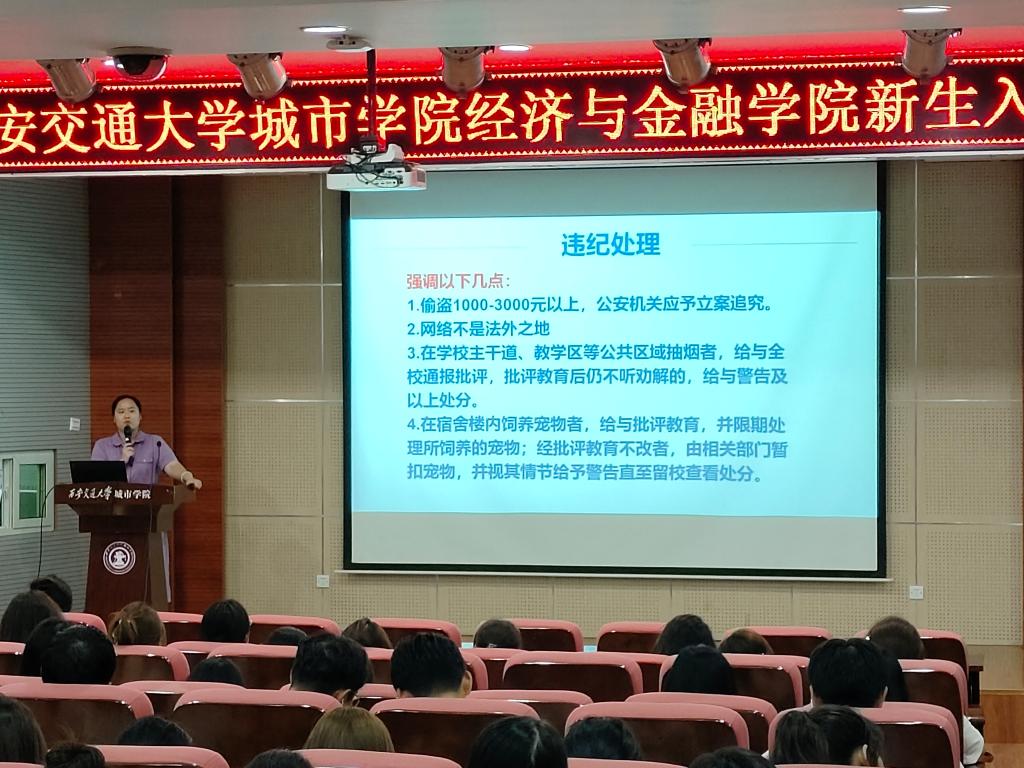 经济与金融学院于9月19日在F100召开2024级新生入学教育之校纪校规、课外素质认证教育,本次会议由经济与金融学院学工办杨静怡、张进主讲,2024级全体新生参加。
