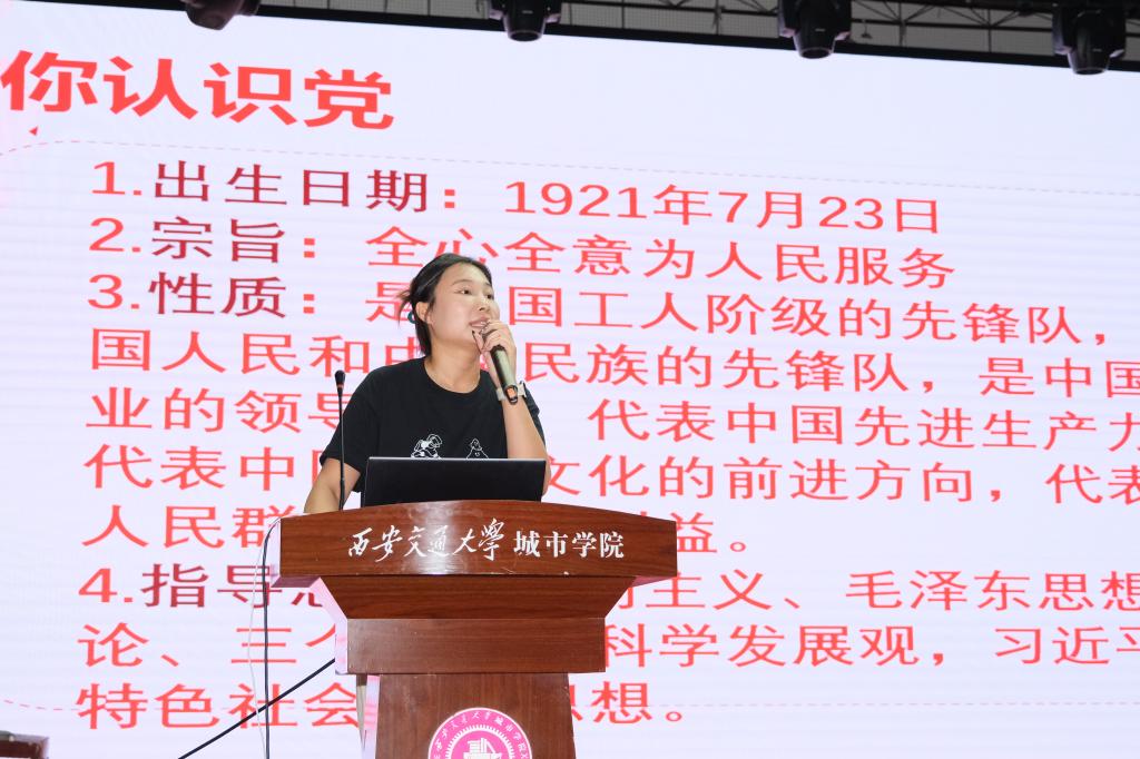 廉宇婷结合中国共产党党史,分别从入党动机、入党流程,党员要求,奉献精神为新生阐述如何加入中国共产党并成为一名优秀的共产党员,她强调作为新时代青年要发挥出应有的使命和担当,立志要大、做人要实,落实好每一件有意义的事,不忘初心跟党走,为中华民族伟大复兴贡献青春力量。