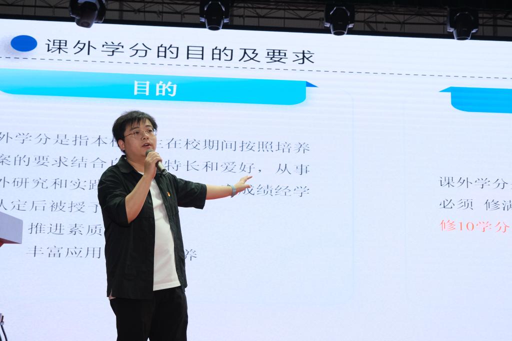 杨静怡向新生们详细解读了校纪校规的主要内容,包括学籍管理、考勤制度、考试纪律、奖惩规定,并结合实际案例,深入剖析了违反校级校规的负面影响,要求同学们自觉遵守校纪校规,内化于心,外化于行,共同营造良好的校园氛围。随后,张进讲解了课外十学分体系、申请方法、管理及认定等相关内容,鼓励同学们结合自己的特长及爱好,积极参与课外社会实践、科学研究、学科竞赛、技能训练,提升自身综合能力,全面发展。