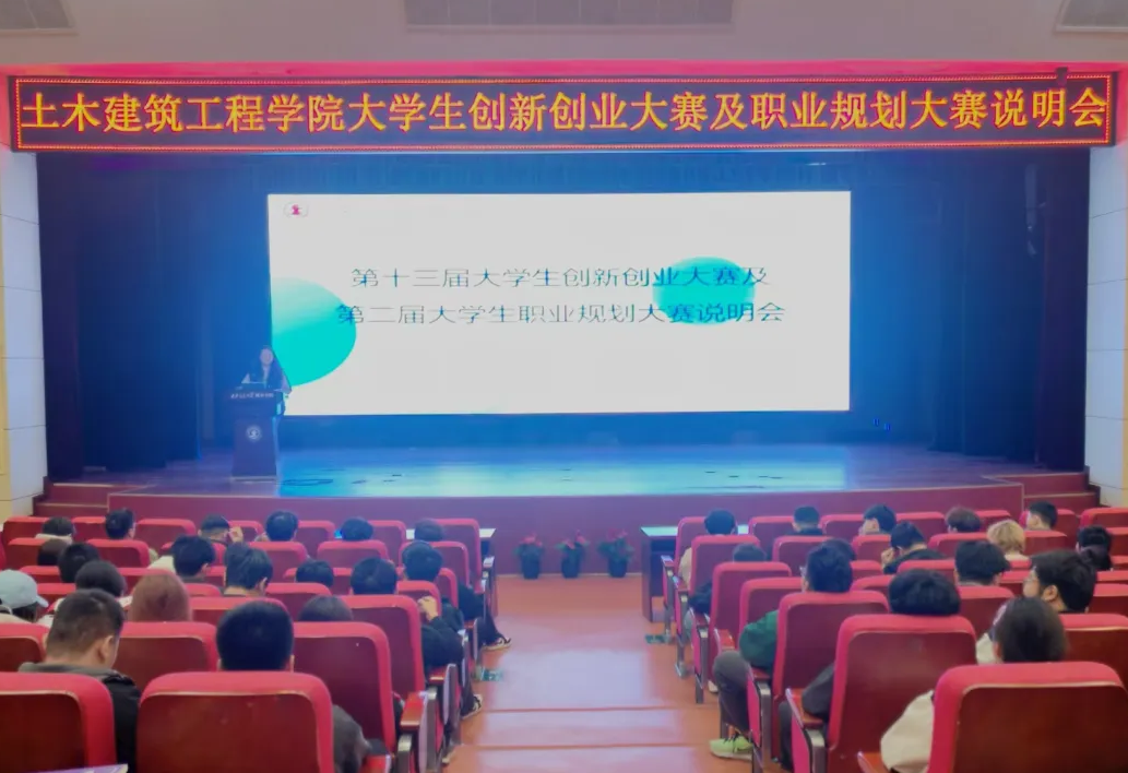 为激发学生兴趣与潜能,培养创新意识、创新思维、创业能力以及团队协同实战精神,土木建筑工程学院11月15日在教二报告厅举办了大学生创新创业大赛及职业规划大赛说明会。