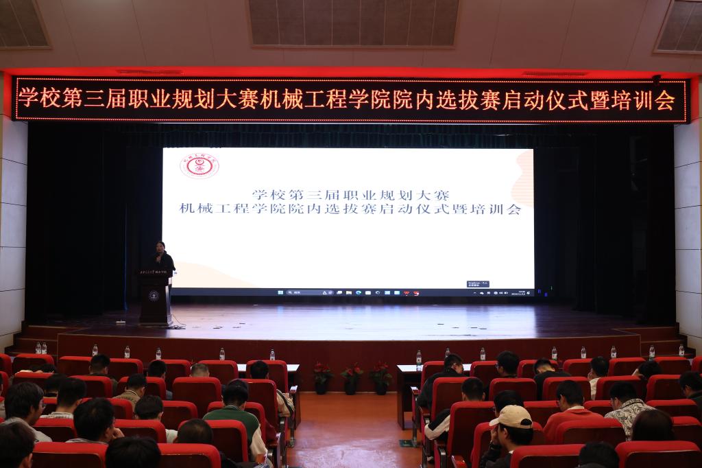 近期,为帮助学生明确职业方向,提升职业规划能力,机械工程学院职业规划大赛院内选拔赛启动仪式暨培训会于教二报告厅举行,参加本次启动仪式的有机械工程学院辅导员史晓薇、张哲源、童治杰、王令、张元婕,本次大会由机械工程学院院长助理王丽丽主持召开。