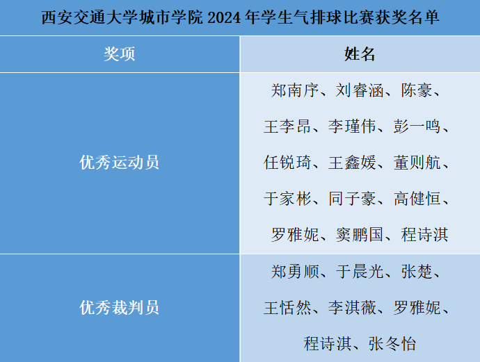 在为期11天的激烈角逐中,各学院代表队纷纷展现出强大的实力和出色的战术配合。经过多轮比拼,最终决出了各个组别的前三名。本次比赛中,郑南序等15名同学获得了“优秀运动员”称号,他们凭借出色的身体素质、精湛的排球技艺和顽强的拼搏精神,在比赛中屡创佳绩,为观众带来了无数精彩瞬间。同时,我们的裁判员们以高度的专业素养和无私的奉献精神,确保了比赛的公平、公正与顺利进行,其中郑勇顺等8名同学获得了“优秀裁判员”称号。