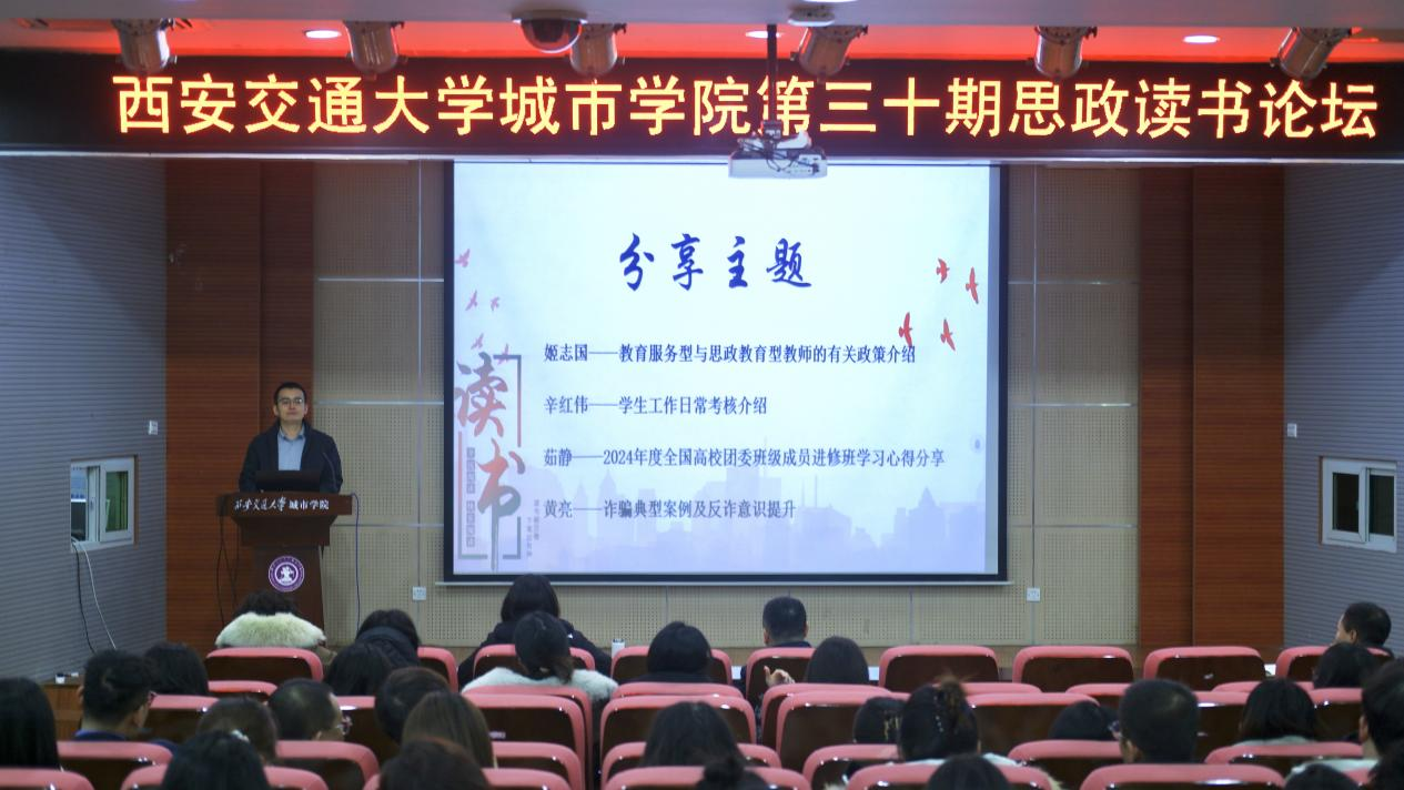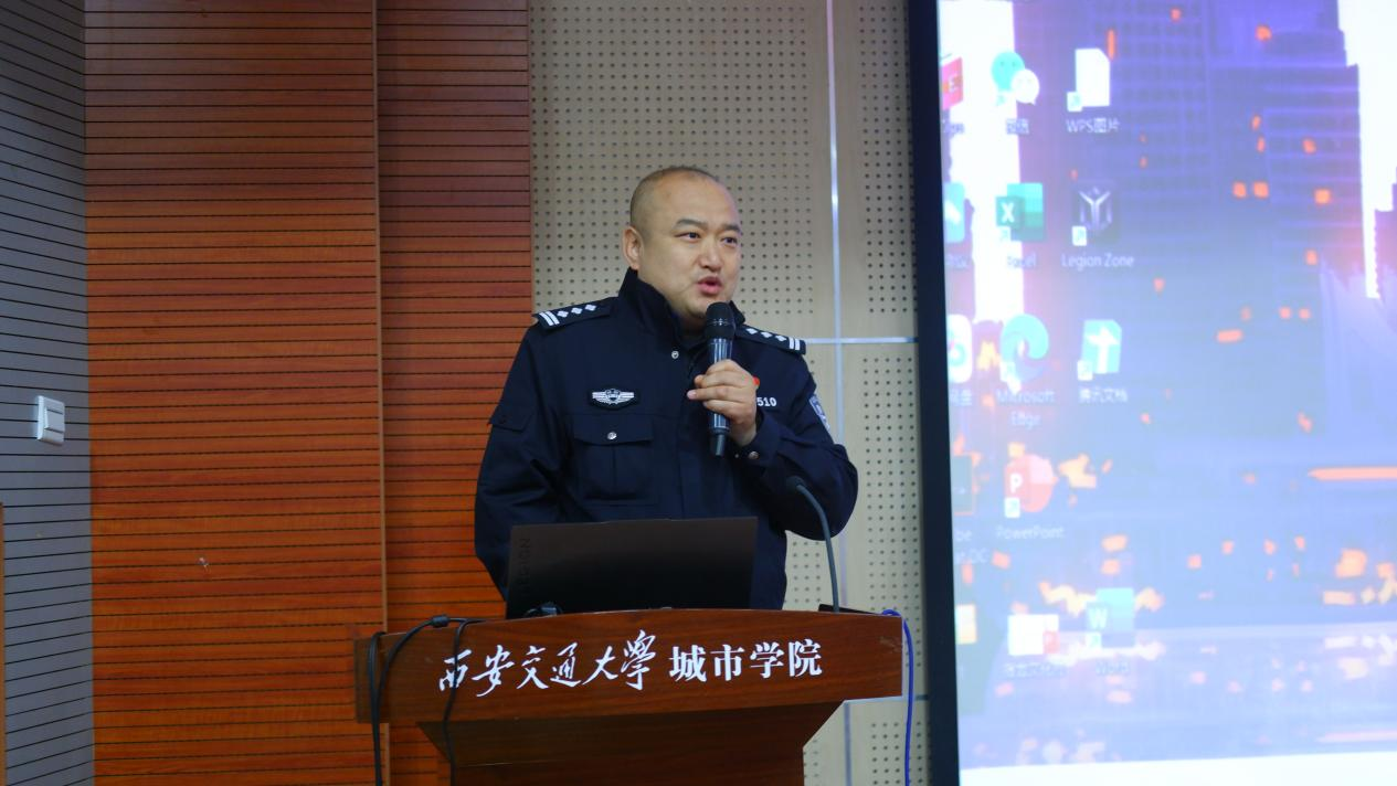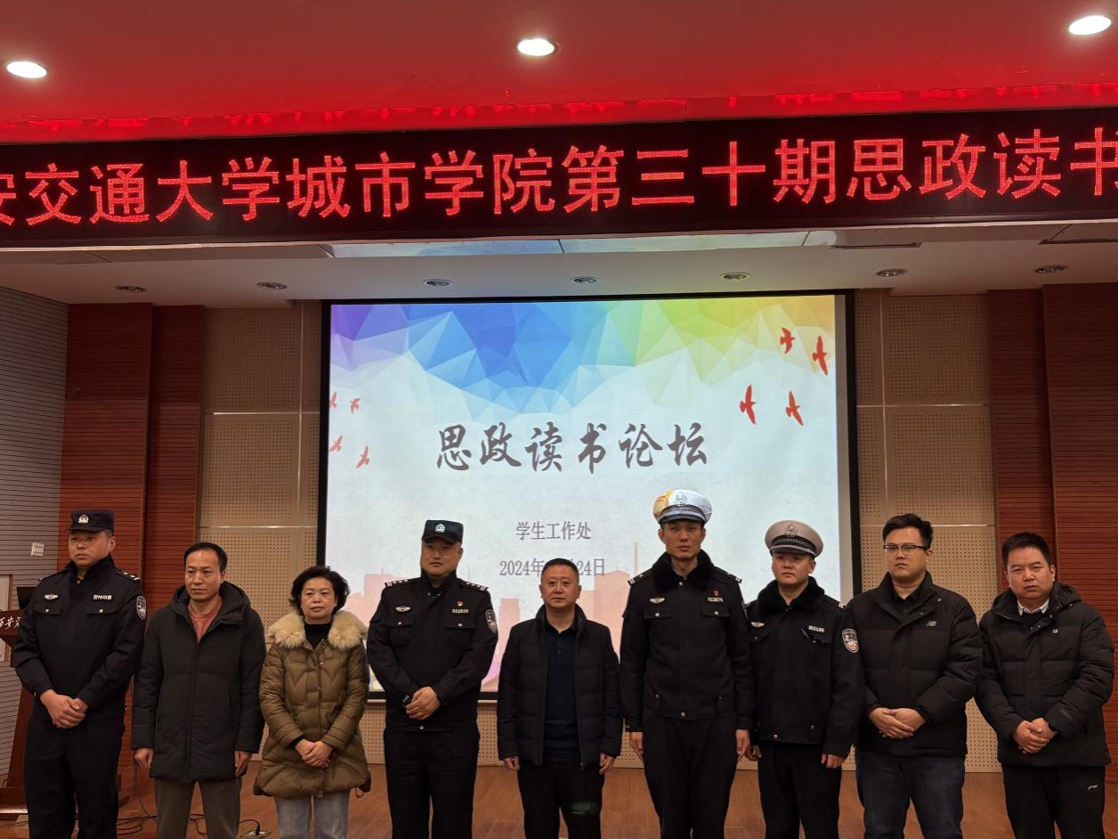 12月24日,西安交通大学城市学院举办第三十期思政论坛。西安市公安局经开分局尚稷路派出所社区服务队队长黄亮,经开大队草滩中队副中队长李涛等四位干警受邀参加。学校行政人事部部长姬志国,学生工作处处长辛红伟,保卫处处长李凡昊,党委工作部副部长、团委书记茹静,学生工作处副处长姚敏、张福全,保卫处治安管理科科长冯西军,各二级学院学生工作负责人及全体辅导员老师到场参加。