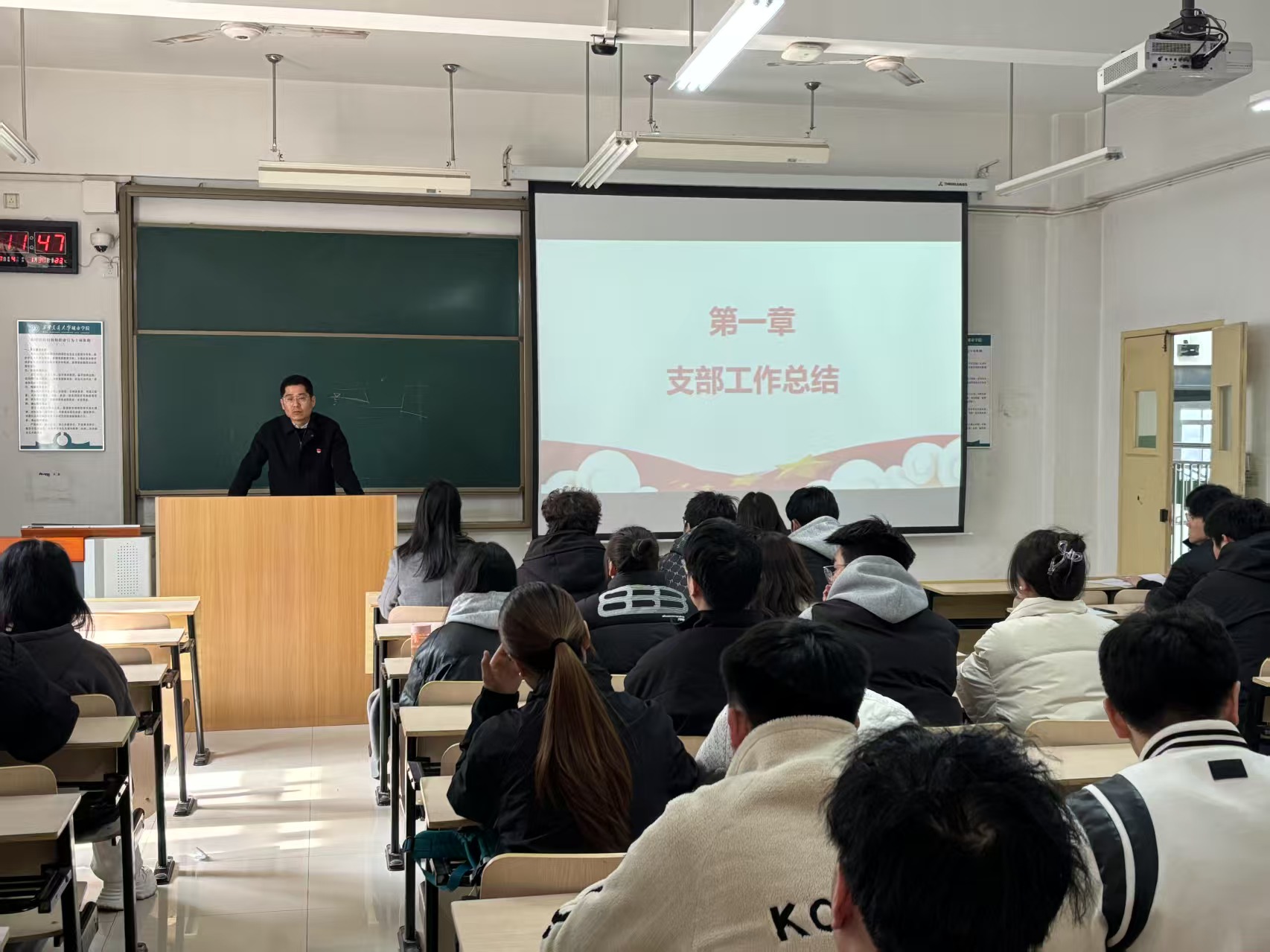 李辉向全体党员介绍了2024年的党支部工作开展情况,对过去一年大家的辛苦付出表示肯定,指出了在支部建设和党员队伍当中存在的几个问题及现象,要求全体学生党员要积极发挥先锋模范作用,牢记党员的身份与责任,把党员的权利与义务落到实处。针对新学期工作,李辉强调需重点加强支部规范化建设,新的一年党支部要加强党员教育管理,要重视组织建设,增强支部党员的凝聚力;要不断加强纪律教育和监督管理,确保学生党员的良好作风。