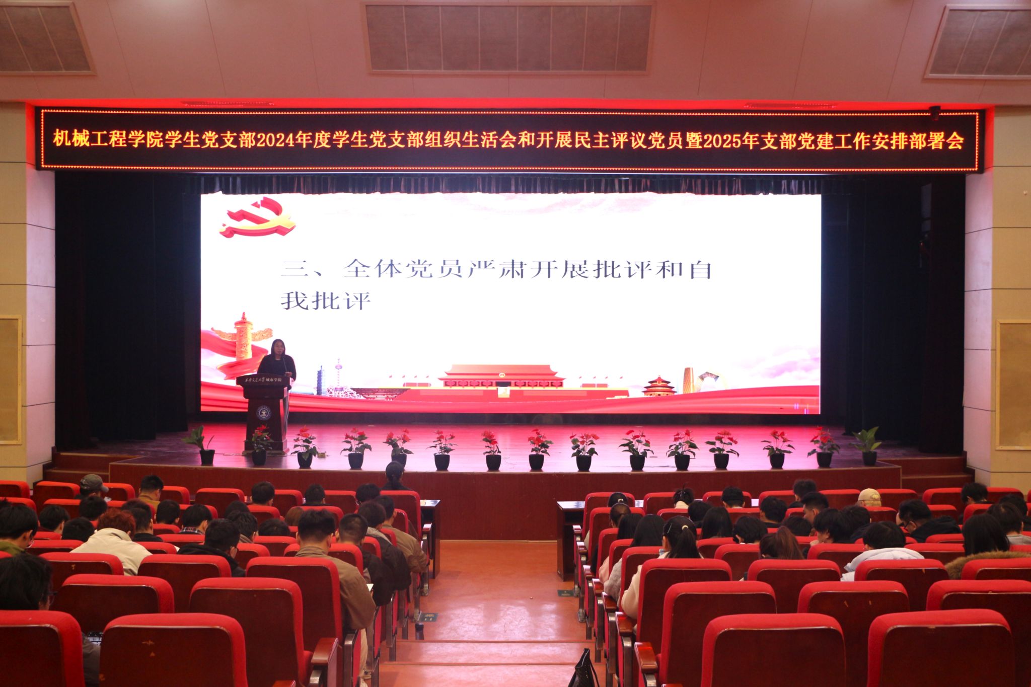 机械工程学院学生党支部于2月26日在教二报告厅召开全体党员大会,会议主题为2024年度党支部组织生活会和开展民主评议党员暨2025年支部党建工作计划及安排部署。机械工程学院学生党支部书记王丽丽、组织委员史晓薇、宣传委员童治杰及支部全体党员出席本次大会。本次会议由支部组织委员史晓薇主持。