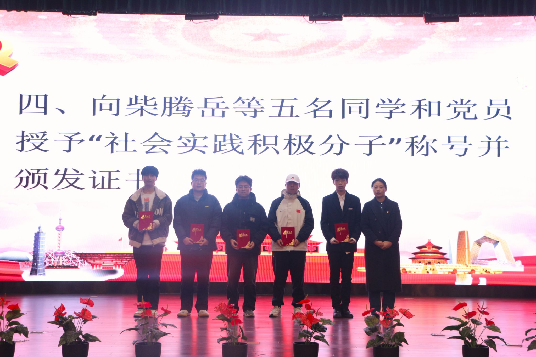 为表彰先进、树立典型,经组织研究决定授予张元雨等五名学生党员“社会实践积极分子”荣誉称号,并由王丽丽颁发荣誉证书。