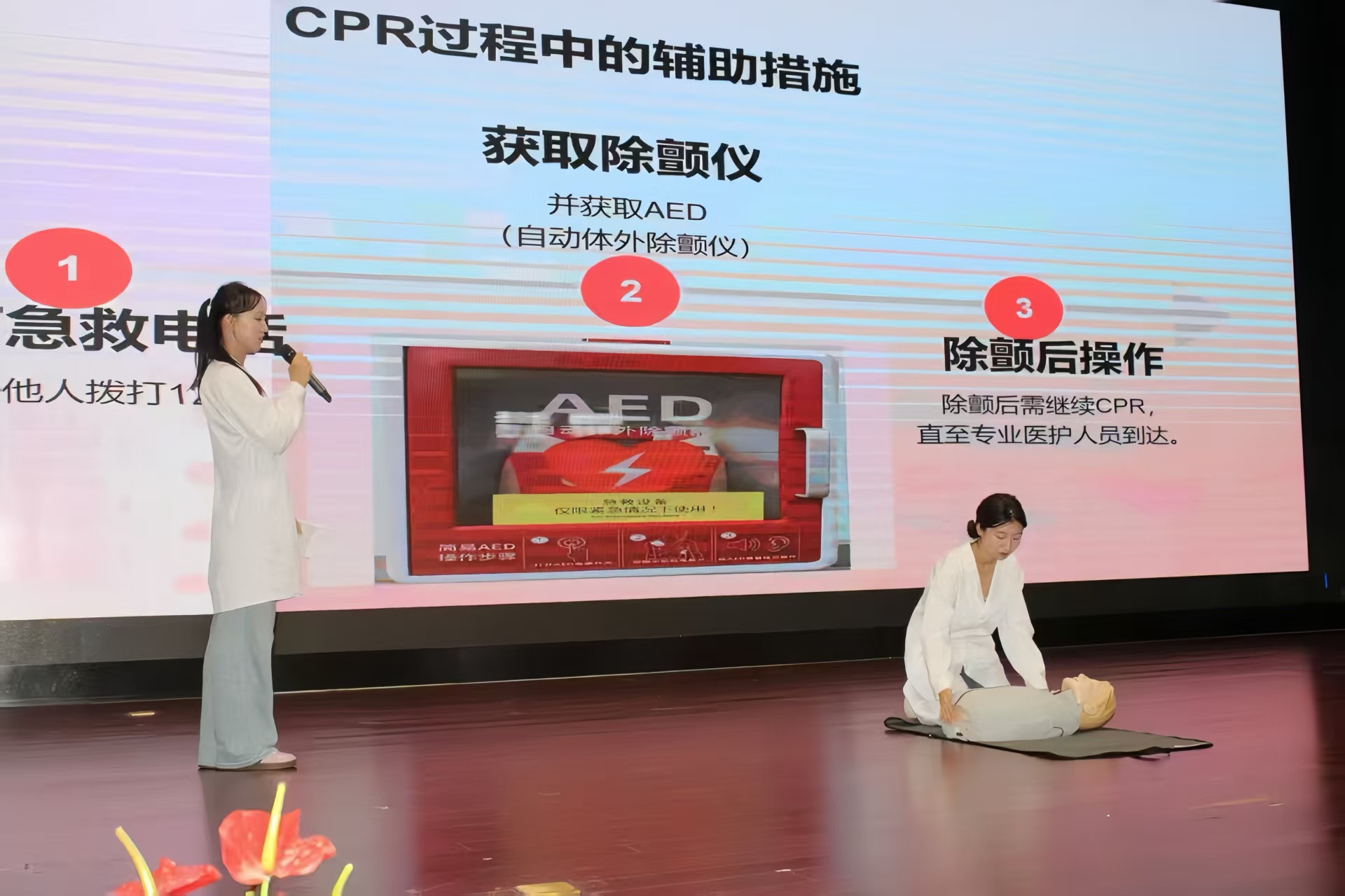 随后,护理与康复学院的同学带来了一场极具实用性的“安全微讲座”,围绕心肺复苏(CPR)、癫痫紧急处理、同学晕倒应急措施等关键知识点,通过清晰的步骤讲解与要点强调,让在场师生快速掌握了基础急救技能,为应对校园突发健康事件增添了“安全砝码”。理论学习之后,“安全知识快问快答”互动环节点燃了现场气氛。主持人围绕校园安全、宿舍用电、消防安全等常识性问题进行提问,同学们积极举手、抢答踊跃,在轻松的互动中进一步巩固了安全知识。紧接着,学院学习生活部负责人马子萱同学上台,为在场师生详细预告了本届宿舍文化节的完整活动安排,丰富多样的活动内容让同学们对本届文化节充满期待,也明确了后续参与方向。最后,刘健老师作总结动员讲话,鼓励全体同学以本次活动为契机,主动学习安全知识、积极参与文化活动,在保障自身安全的前提下,共同打造有温度、有内涵、有特色的经管宿舍文化,让安全与韶华同行,让温暖与成长相伴。