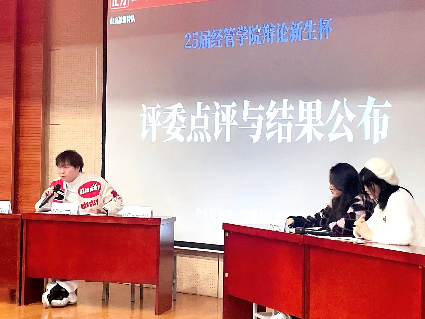 比赛伊始,正反双方开篇立论条理清晰,明确己方立场。攻辩环节中,双方辩手反应敏捷,犀利的提问与巧妙的反驳引得现场掌声不断。自由辩论阶段,双方更是引经据典、逻辑缜密,将比赛氛围推向高潮;结辩环节,双方四辩沉稳总结,既梳理了全场观点,又深化了辩题内涵,展现出扎实的思辨功底与团队协作能力。最终红高粱模特队的田芷葳、滑鑫娱、王书悦、胡宇光获得冠军,胡宇光获得“最佳辩手”称号。赛后,学院团工委书记柯智航对本次比赛进行总结发言。他肯定了两支队伍的精彩表现,鼓励全体新生将赛场上的思辨精神融入日常学习与生活,在探索与思考中找准方向,成长为兼具独立思想与社会责任感的经管人才。