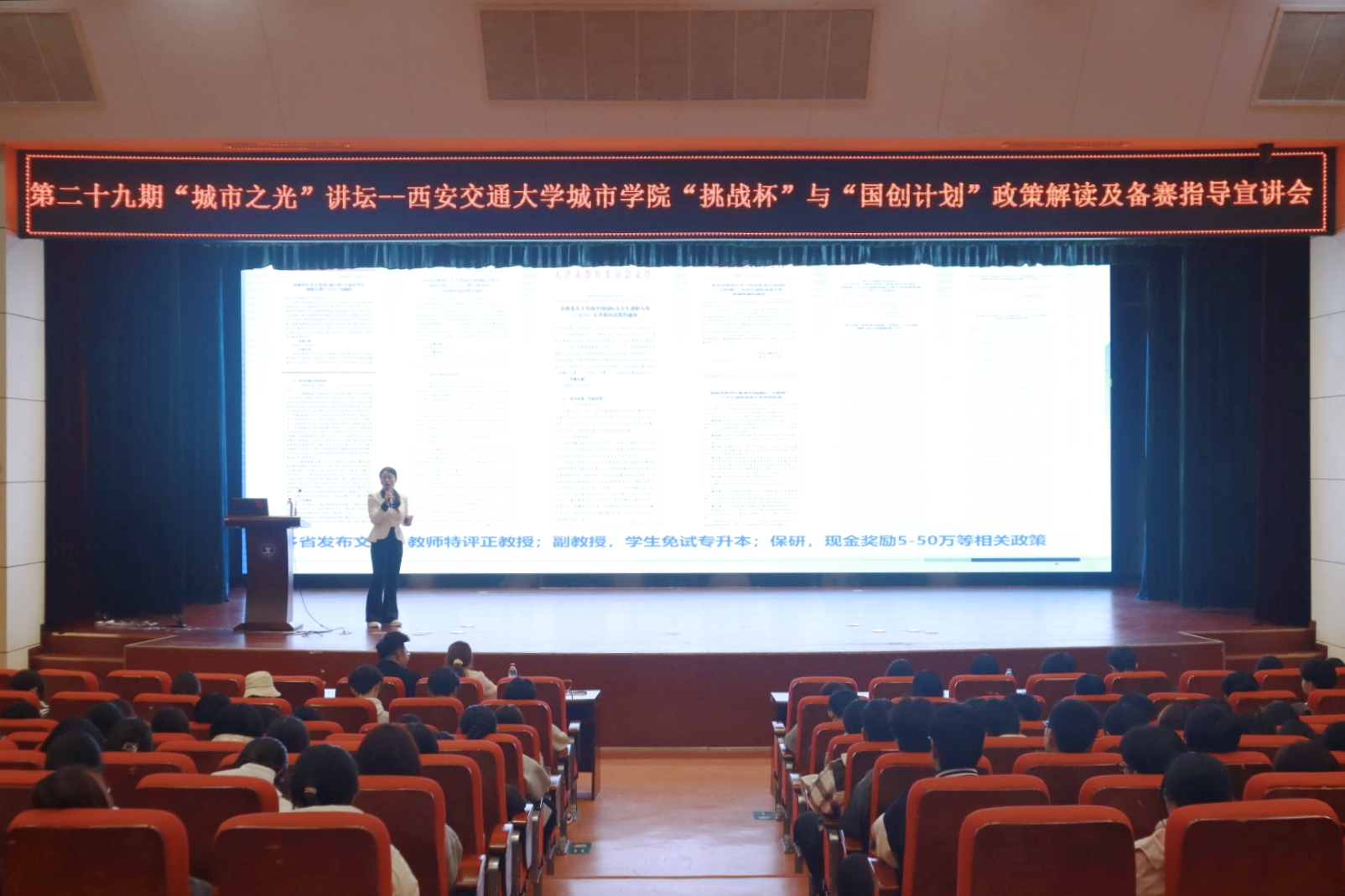 10月30日,西安交通大学城市学院第二十九期“城市之光”讲坛在教二报告厅举行。本次讲坛聚焦“挑战杯”与“国创赛”两大重点赛事,邀请西安人社局就业导师、陕西省创新创业专委会创新创业导师、清华创业孵化园启迪资本创业导师李紫钰主讲,400余名学生参与活动。