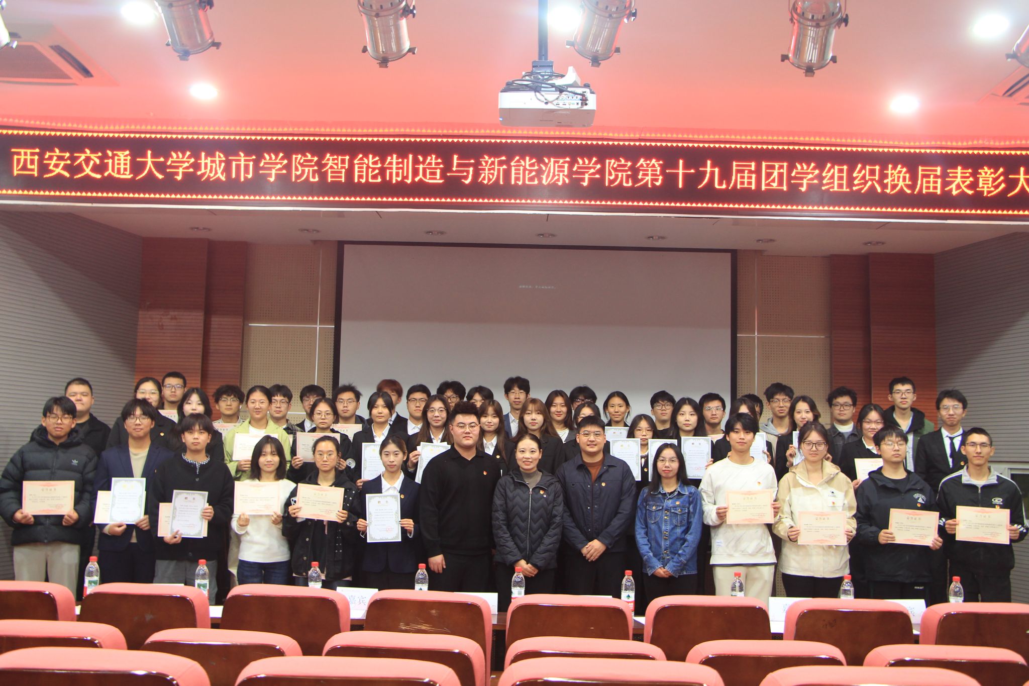为进一步加强智能制造与新能源学院学生干部队伍建设,充分发挥青年学生组织的引领与服务作用。10月31日,学院召开第十九届团学组织换届暨总结表彰大会,院长助理、学生党支部书记王丽丽,党支部组织委员史晓薇,党支部宣传委员童治杰,学生会主席团柴腾岳、罗晓彤、王雪冬、邓德臣,第十八届、第十九届团学组织全体成员参会。会议由学院团工委书记张哲源主持。