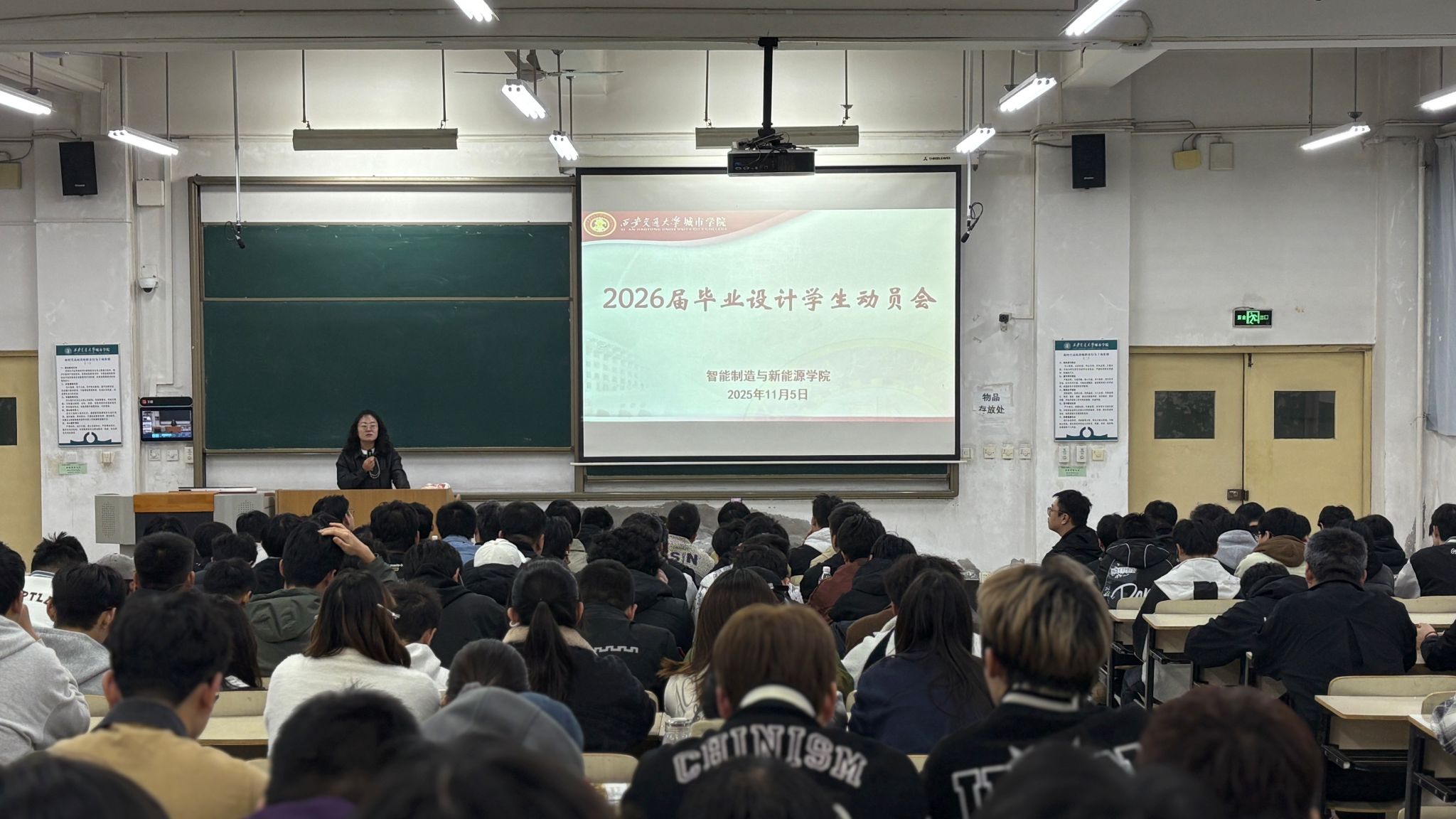 11月5日,智能制造与新能源学院在教学楼A100召开2026届毕业设计动员会。院长助理门静、院办公室赵瑾及2026届全体学生代表参会,会议由门静主持。