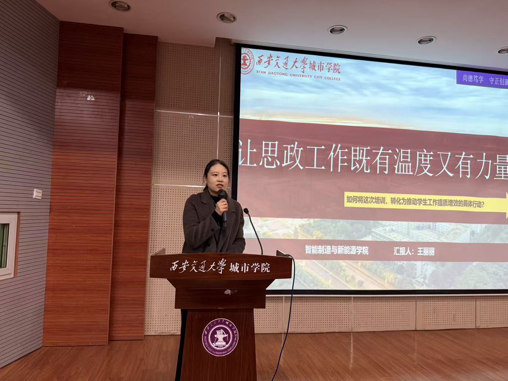 智能制造与新能源学院学生工作负责人王丽丽以《让思政工作既有温度又有力量》为主题进行分享。她提出,富有“温度”的思政工作能有效拉近师生距离,消除学生的戒备心理,建立起牢固的信任关系,这是教育生效的情感基石;同时,具备“力量”的思政工作则能为学生成长提供坚实的精神支撑和清晰的行动指南,帮助他们在复杂环境中坚守方向、稳步前行。