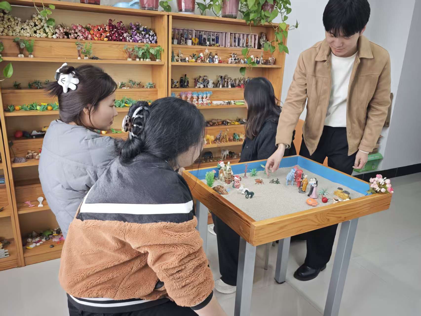 随后,小组成员依次在沙盘中挑选沙具、摆放造型,共同完成一幅幅富有象征意义的沙盘作品。过程中,辅导员们沉浸于沙与具的互动中,感受指尖触沙的放松,体会内心世界的自然流露。在最后的分享环节,辅导员围绕沙盘作品的创作过程与内心感受展开交流。通过真诚开放地分享,团队成员之间建立起更深层次的信任与默契,现场氛围温暖而充满力量。