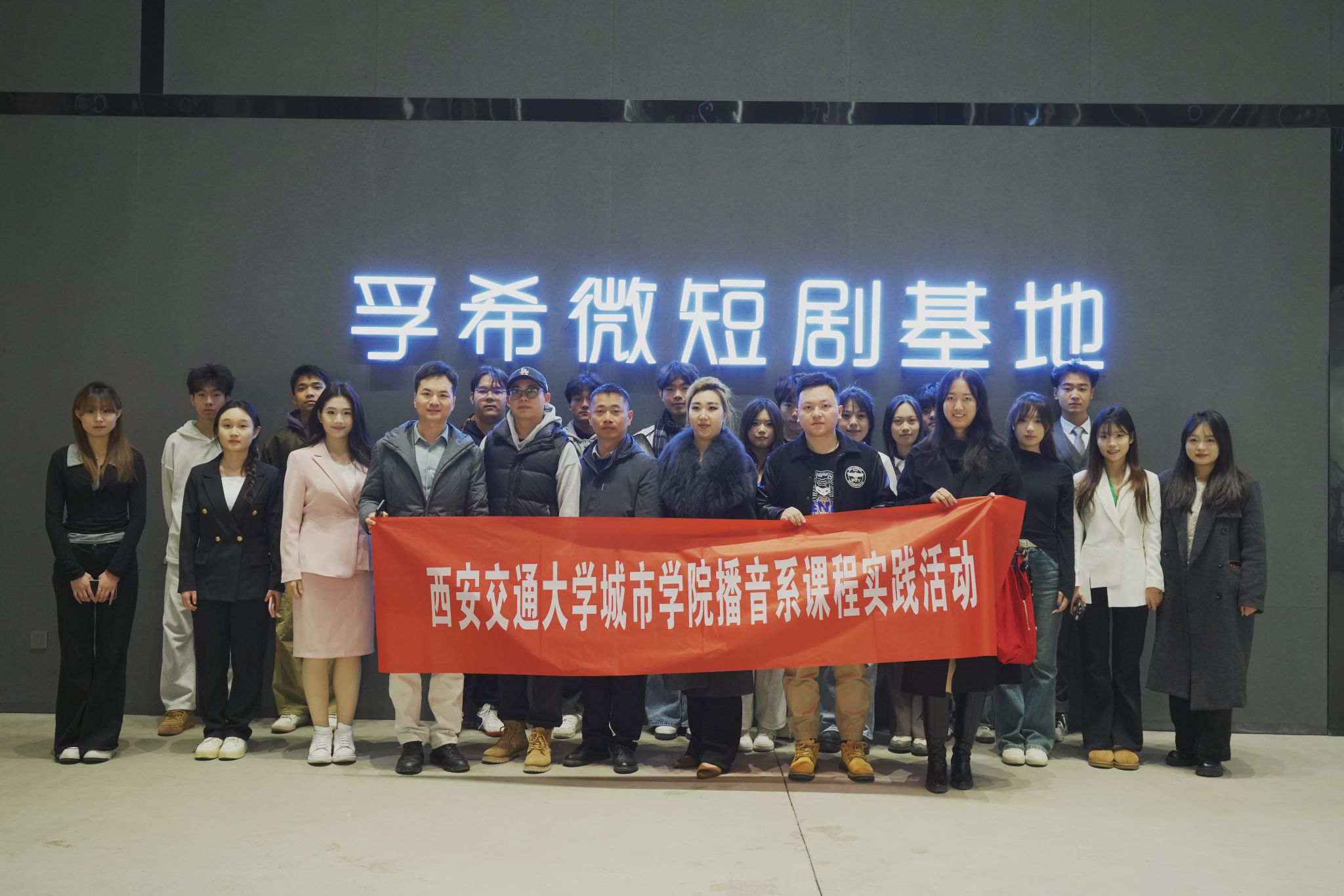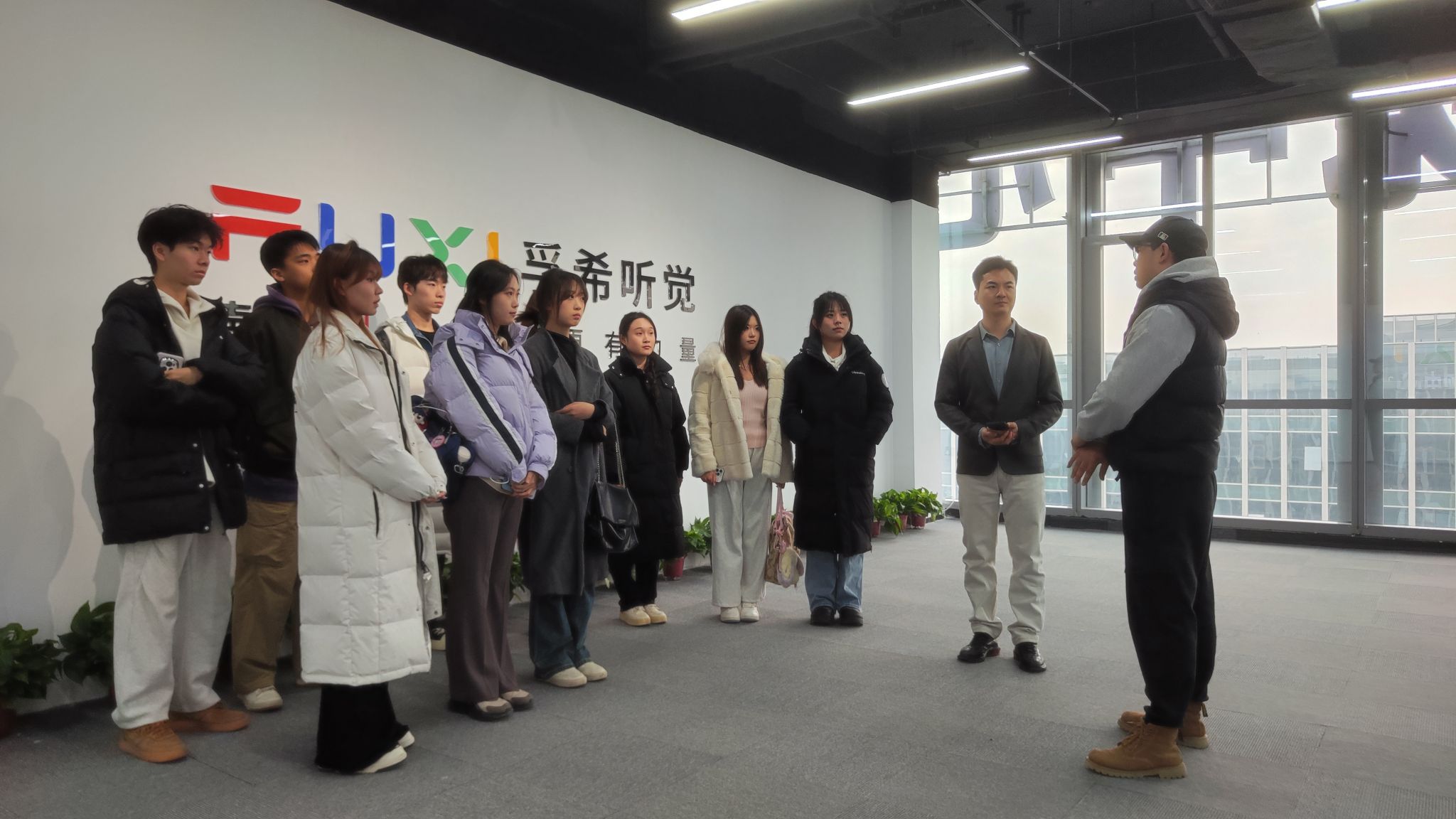 为进一步深化产教融合、拓展实践教学平台,推动播音与主持艺术等相关专业人才培养与行业需求精准对接,12月3日,传媒与外国语学院教师代表和学生代表共20人前往西安市孚希AI影视基地(“微短剧梦工厂”)开展访企拓岗合作洽谈。孚希AI影视基地孚希AI影视中心董事长杨朝、配音运营总监邢友童等公司领导接待了学院一行,双方围绕专业实习基地建设、学生就业等核心议题展开深入交流。