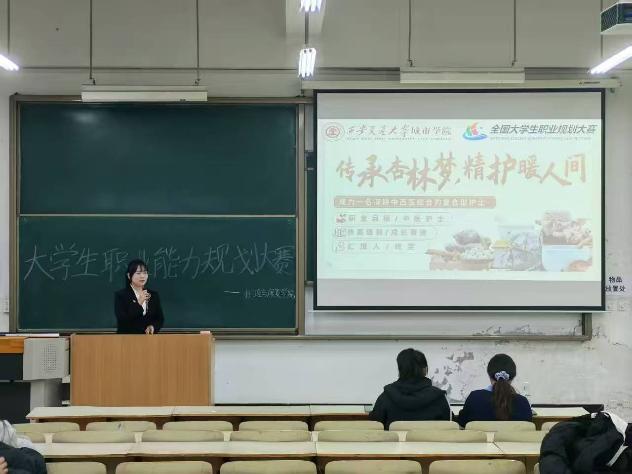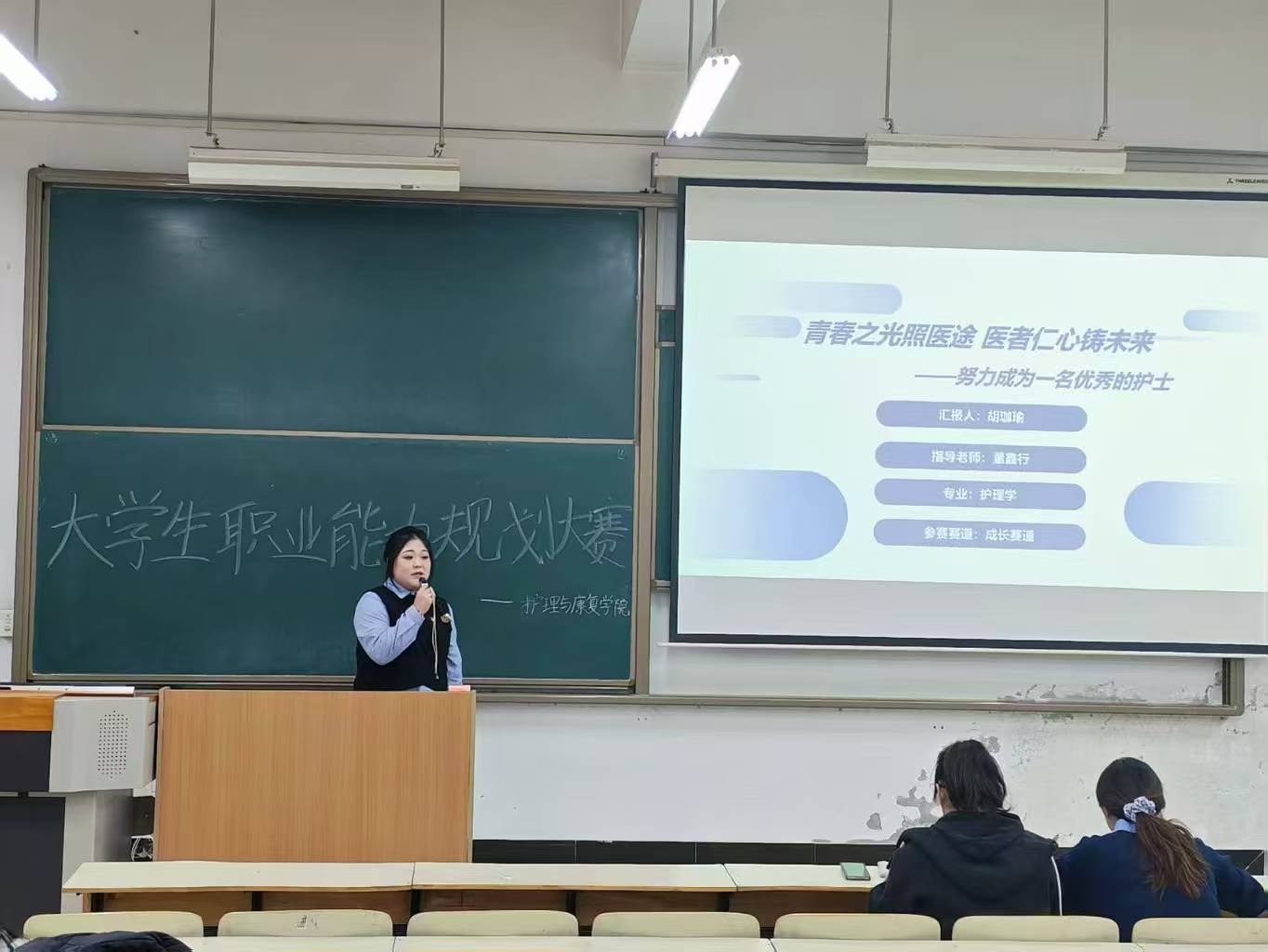 护理与康复学院于12月9日在教学楼C100举办第三届职业能力规划大赛。董鑫行、张妙寒担任评委,参赛选手围绕“成长赛道”与“就业赛道”展开深入交流。