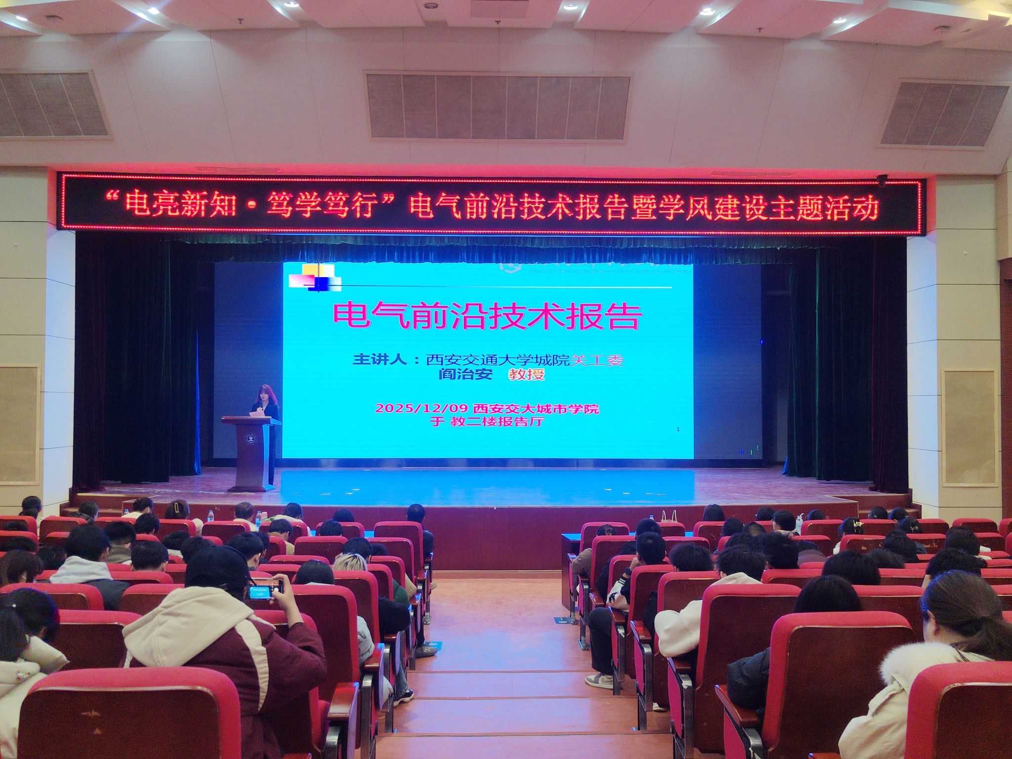 在前沿技术报告结束后,学风建设主题活动正式启动。电气信息学院院长助理廉宇婷进行学风建设政策宣读与动员讲话。她解读了学校及学院关于加强学风建设的相关政策要求,明确了学风建设的核心目标与具体举措。她结合电气专业学习的特点,从课堂纪律、课后复习、科研实践、诚信考试等多个维度,对同学们提出了具体的学习要求与期望。她鼓励同学们树立正确的学习态度,主动搭建互助学习小组,形成比学赶超的良好学习风气,以扎实的专业知识筑牢成长根基。