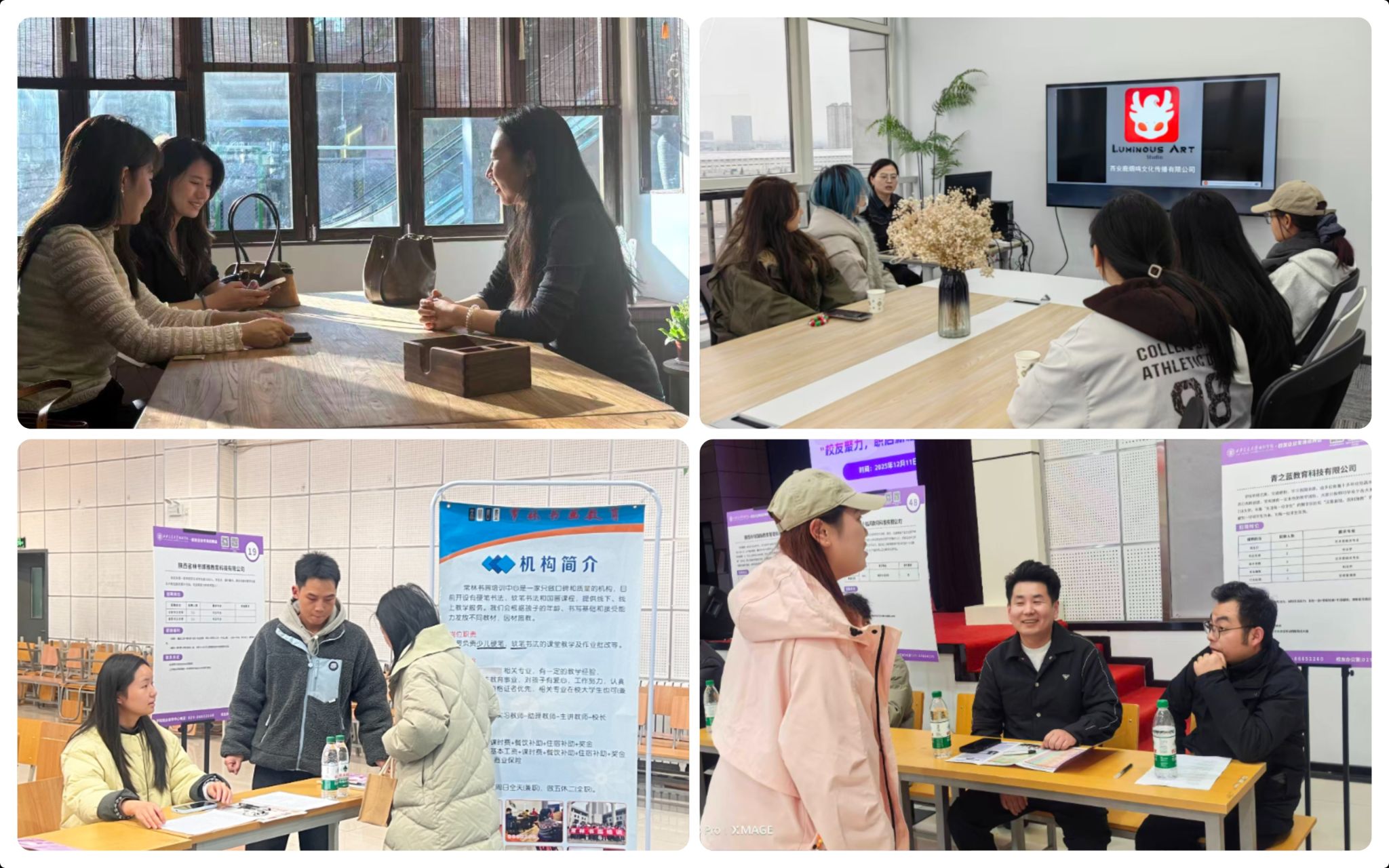 走访聚焦艺术设计、教育服务、游戏动漫等重点领域,与学院书法学、动画、视觉传达设计、环境设计等专业方向紧密对接。在陕西省林书博雅教育科技有限公司走访期间,双方围绕少儿书法教育领域的人才需求展开深入交流,企业负责人细致剖析了相关岗位对毕业生专业技能与综合素养的具体要求。在西安鹿烟鸣文化传播有限公司走访期间,企业方充分肯定了我院动画专业培养方案的实效性,并进一步阐述了当前市场对动漫插画师的核心能力期待。在优势达(陕西)科技有限责任公司走访期间,通过实地参观生产车间、研发中心及面对面交流,学院详细了解了企业的发展脉络、行业前景、人才结构与企业文化。