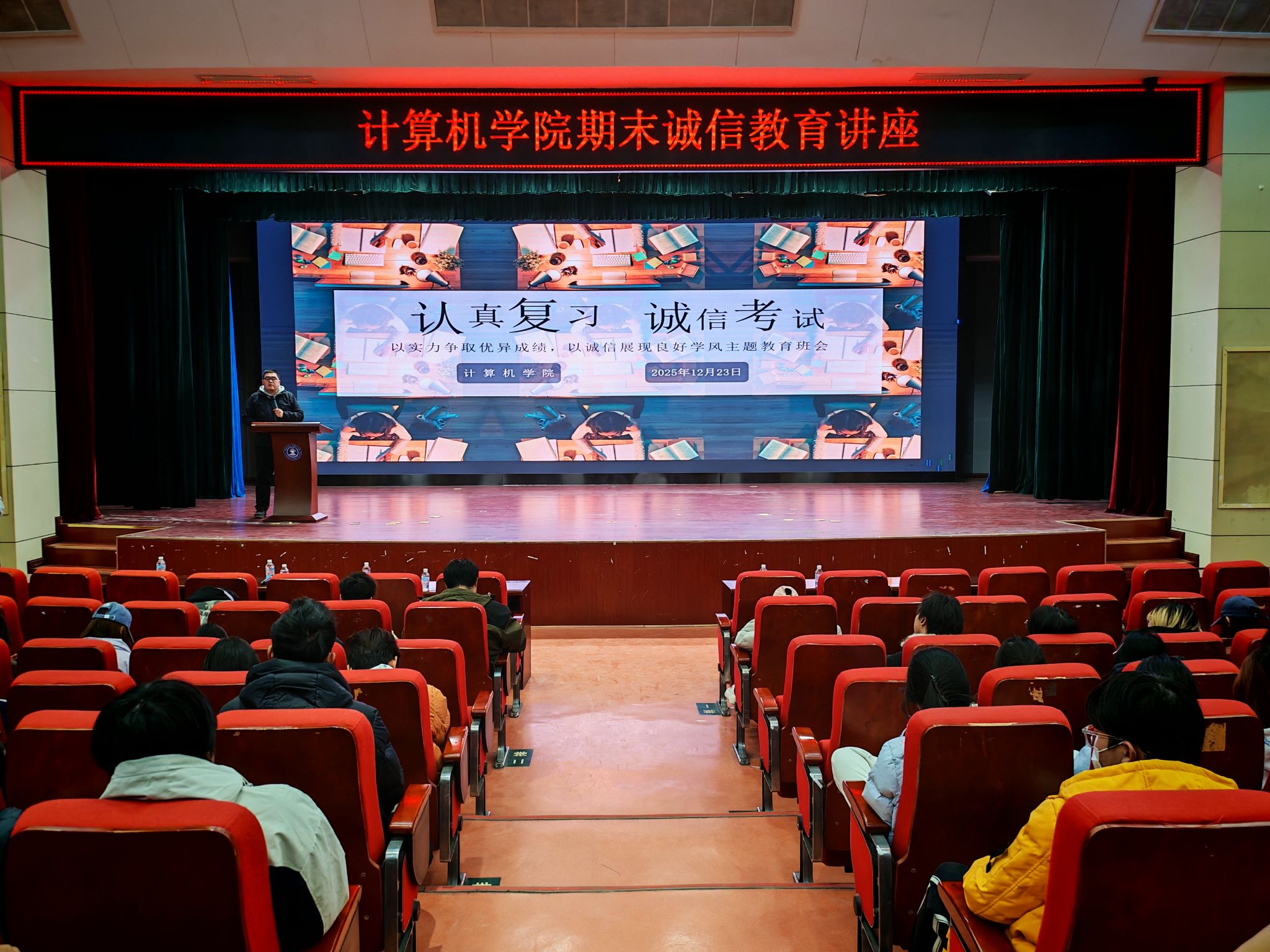 期末将至,为帮助计算机类专业本科新生及专升本新生快速适应大学考试节奏,精准掌握专业科目复习方法,筑牢诚信考试思想防线,12月23日,计算机学院在学校教二报告厅举办2025级学生“认真复习,诚信考试”主题教育活动。学院学生工作负责人崔佳楠、全体新生辅导员及2025级本科新生、专升本新生参与此次活动。