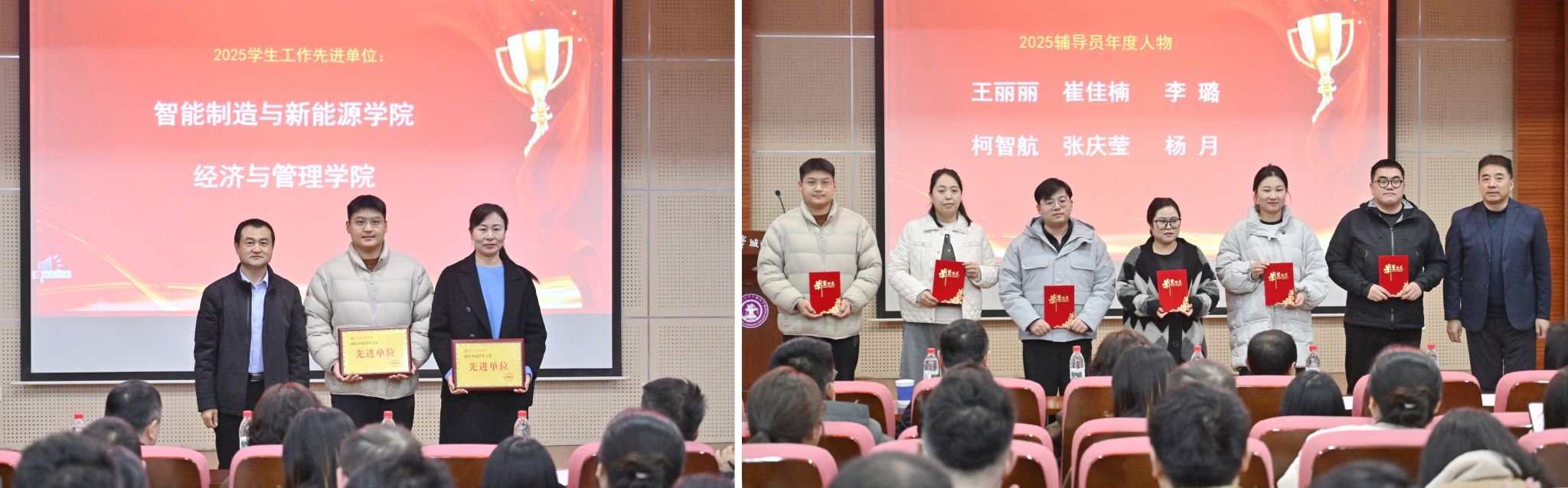 会议对2025年度学生工作先进单位及辅导员年度人物进行了表彰。先进单位代表经济与管理学院院长助理刘建、辅导员年度人物代表计算机学院院长助理崔佳楠作交流发言,分享学生工作经验做法与工作成效。