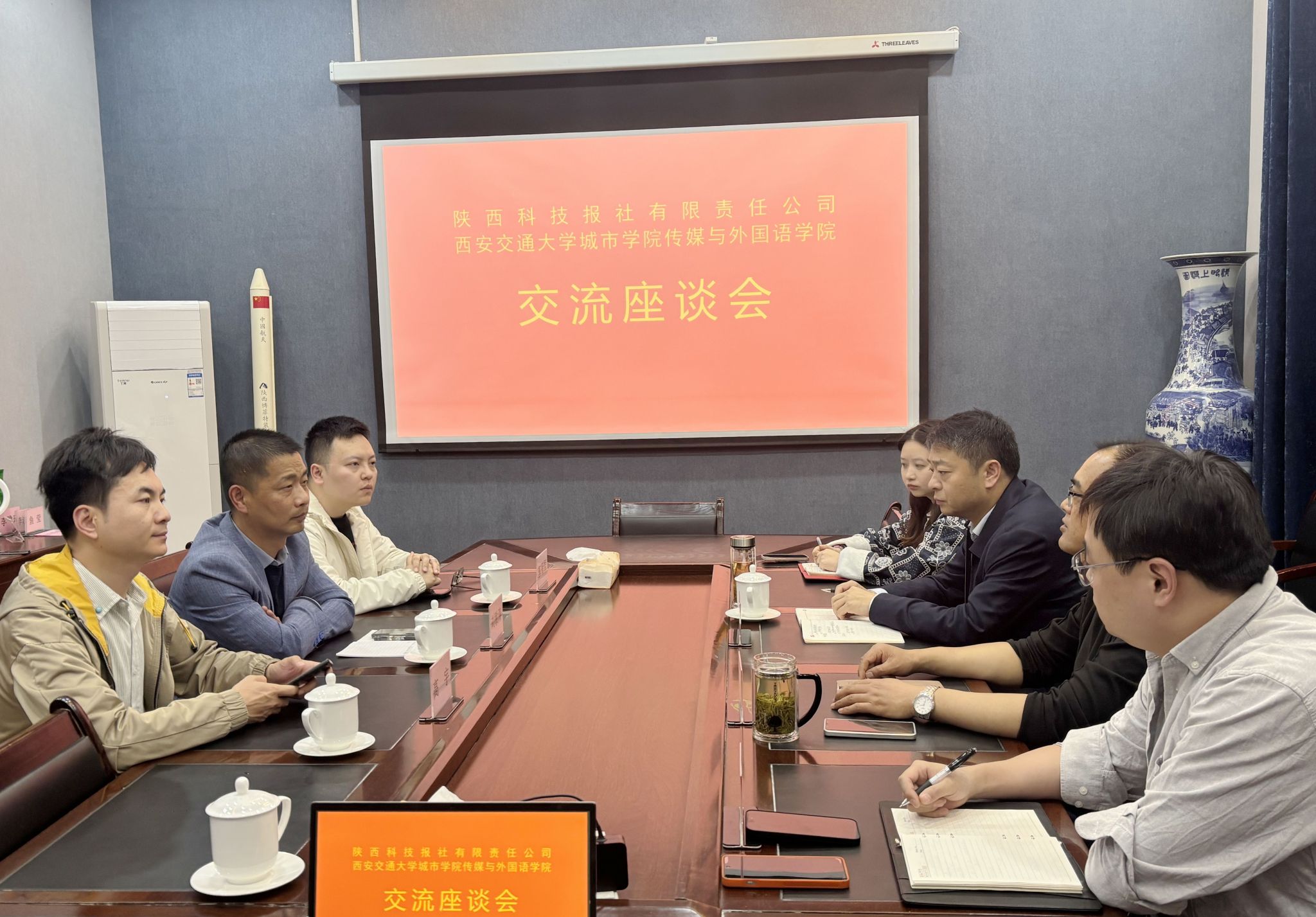 在陕西科技报社,陕西省科协宣传文化部部长、陕西科技报社有限责任公司总经理王童,陕西继续教育大学副校长、陕西科技报社副总编辑彭军对学院一行表示热烈欢迎。座谈会上,王童详细介绍了报社的发展历程、业务布局及人才需求情况。陕西科技报社深耕科普宣传、科技传播领域,近年来积极拓展融媒体业务,形成了涵盖报纸出版、数字内容制作、舆情服务等多元业态的发展格局。