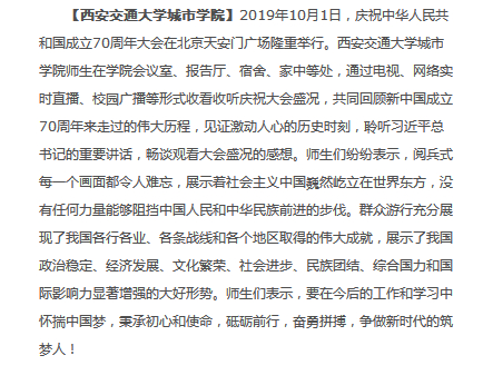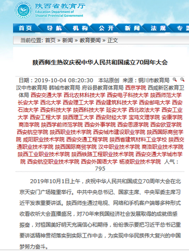 近日,陕西省教育厅对我院师生热议庆祝中华人民共和国成立70周年大会进行了报道。