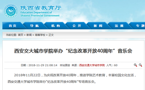 近日,陕西省教育厅门户网站对我院举办“纪念改革开放40周年”音乐会进行了报道。