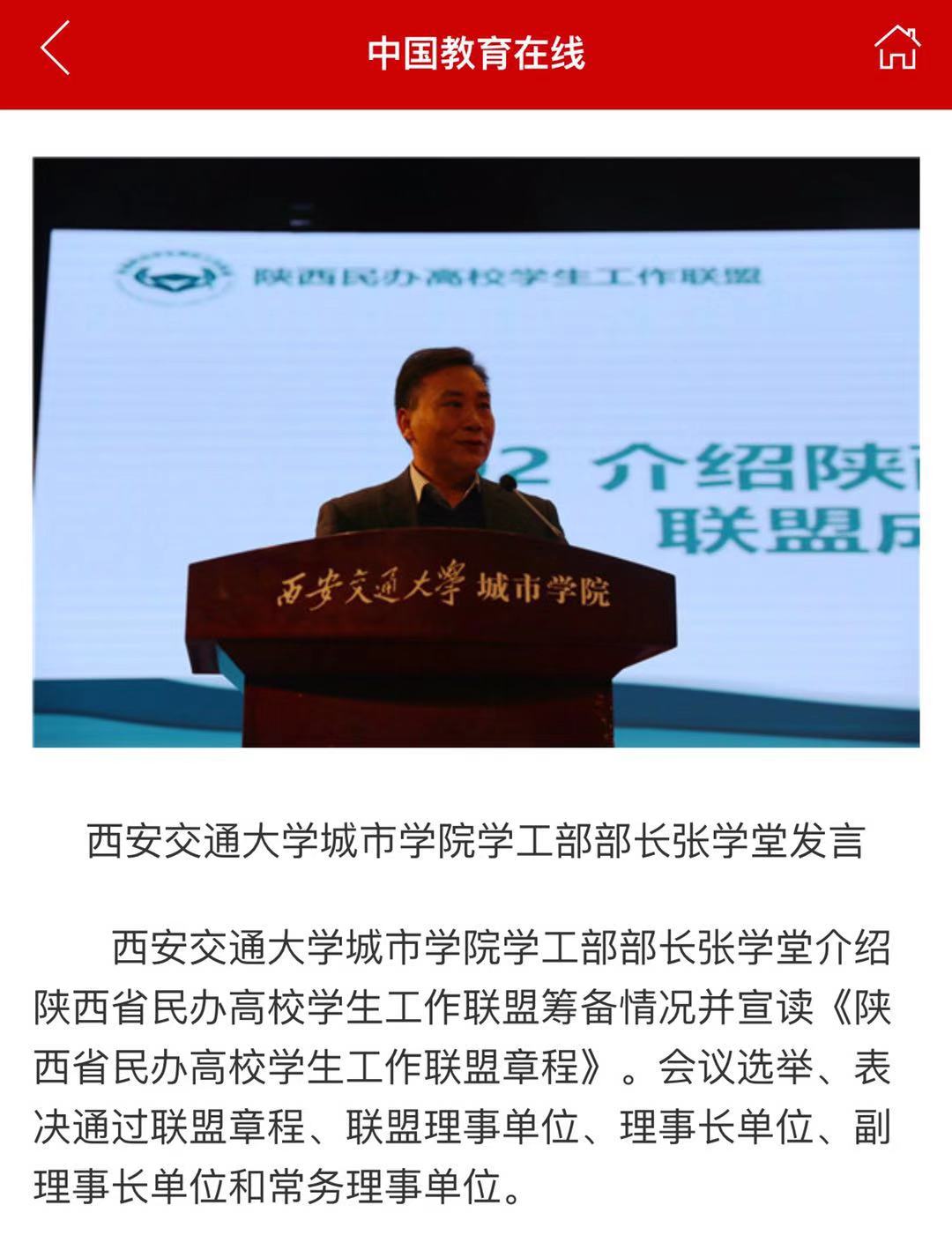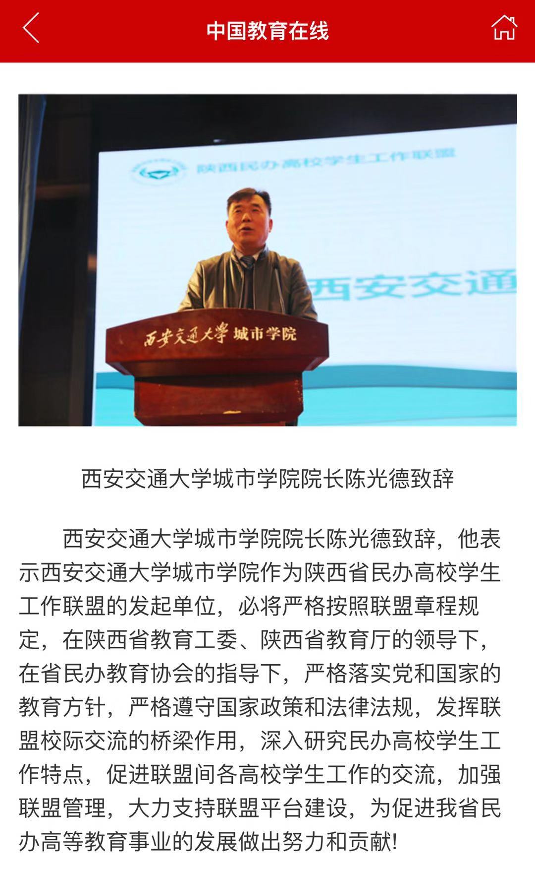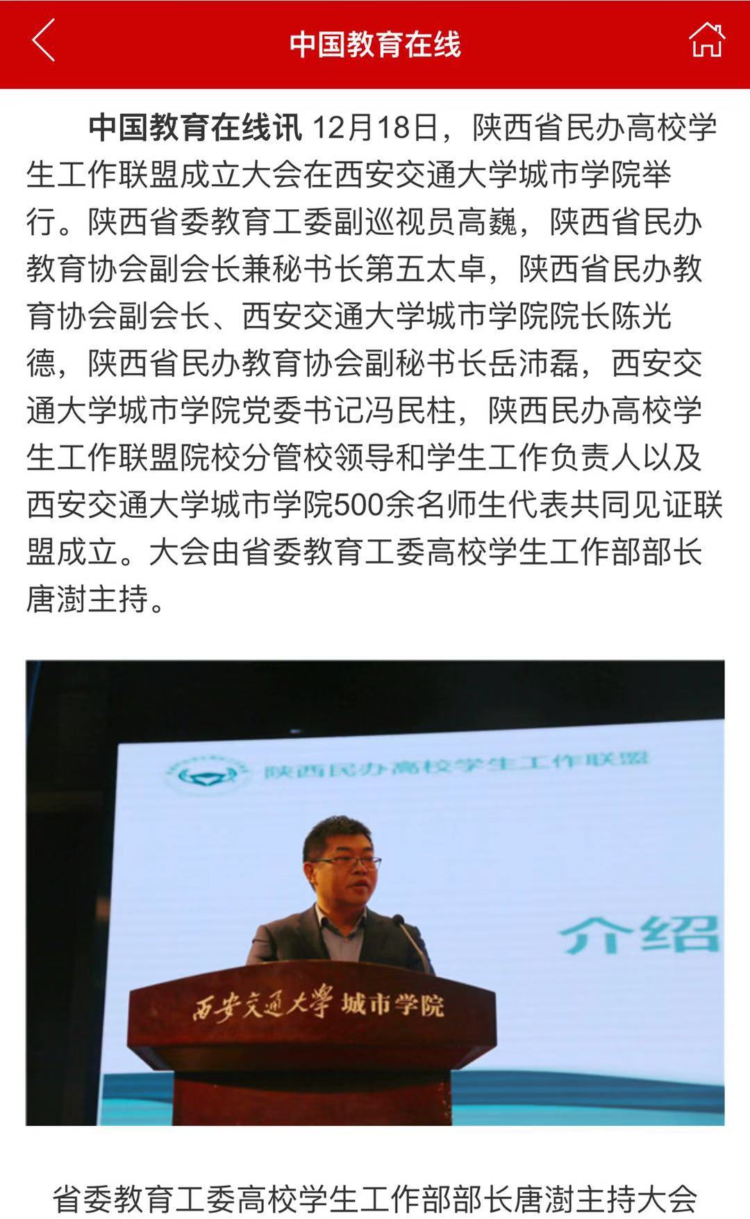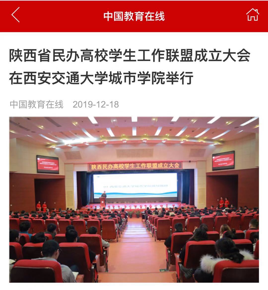 近日,中国教育在线客户端报道了陕西省民办高校学生工作联盟成立大会盛况。据悉,此次大会在西安交通大学城市学院举办。