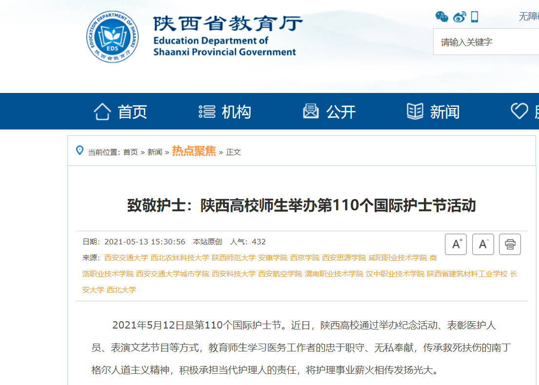 报道链接:致敬护士:陕西高校师生举办第110个国际护士节活动_热点聚焦_新闻_陕西省教育厅 (shaanxi.gov.cn)
