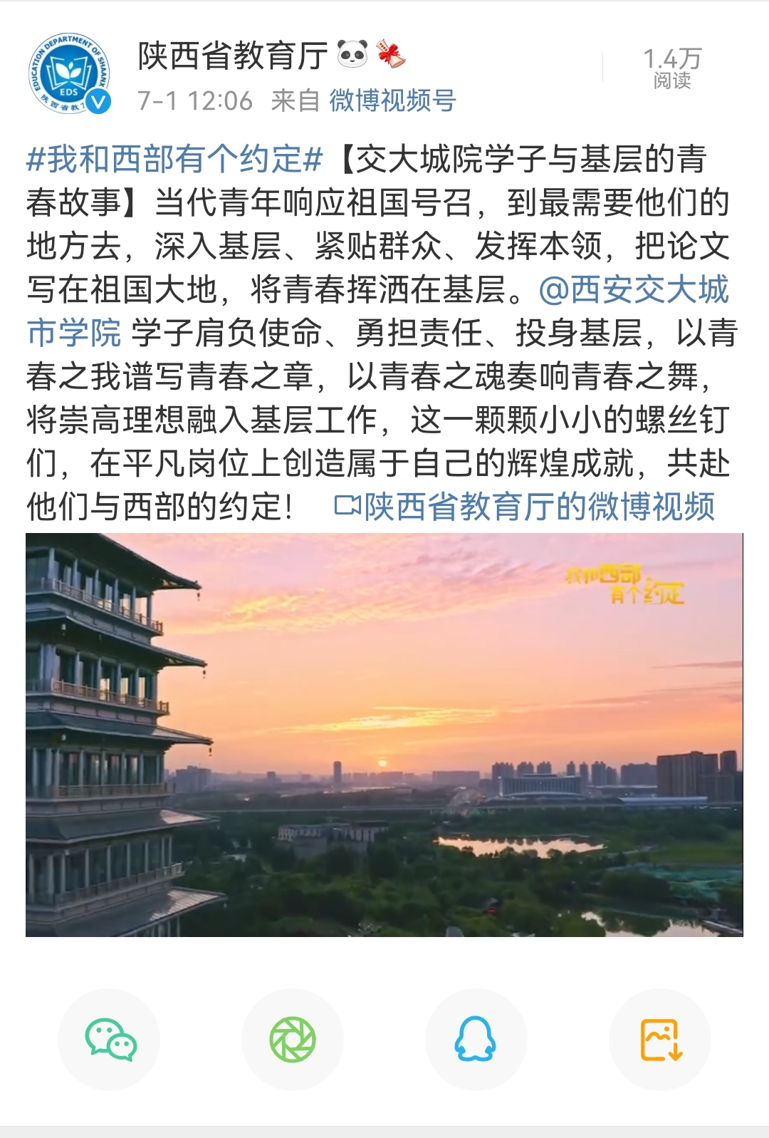 7月1日,陕西省教育厅微博报道了学院学子与基层的故事。