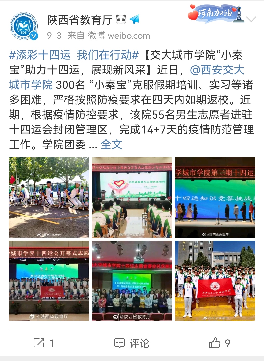 9月3日,陕西省教育厅微博报道了学院“小秦宝”助力十四运的情况。