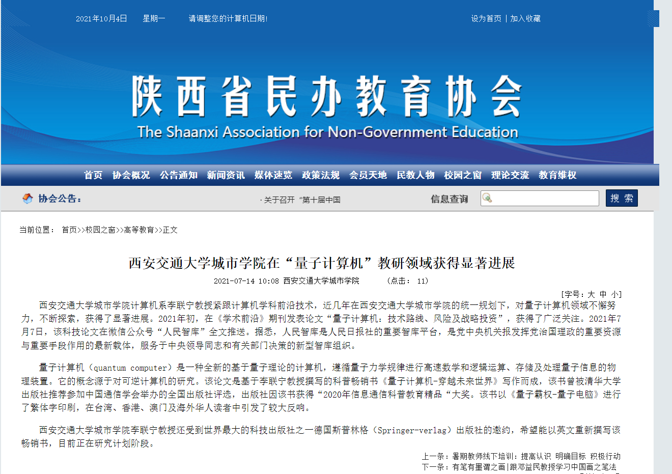 近日,陕西省民办教育协会报道了学院在“量子计算机”教研领域获得显著进展。内容及链接如下: