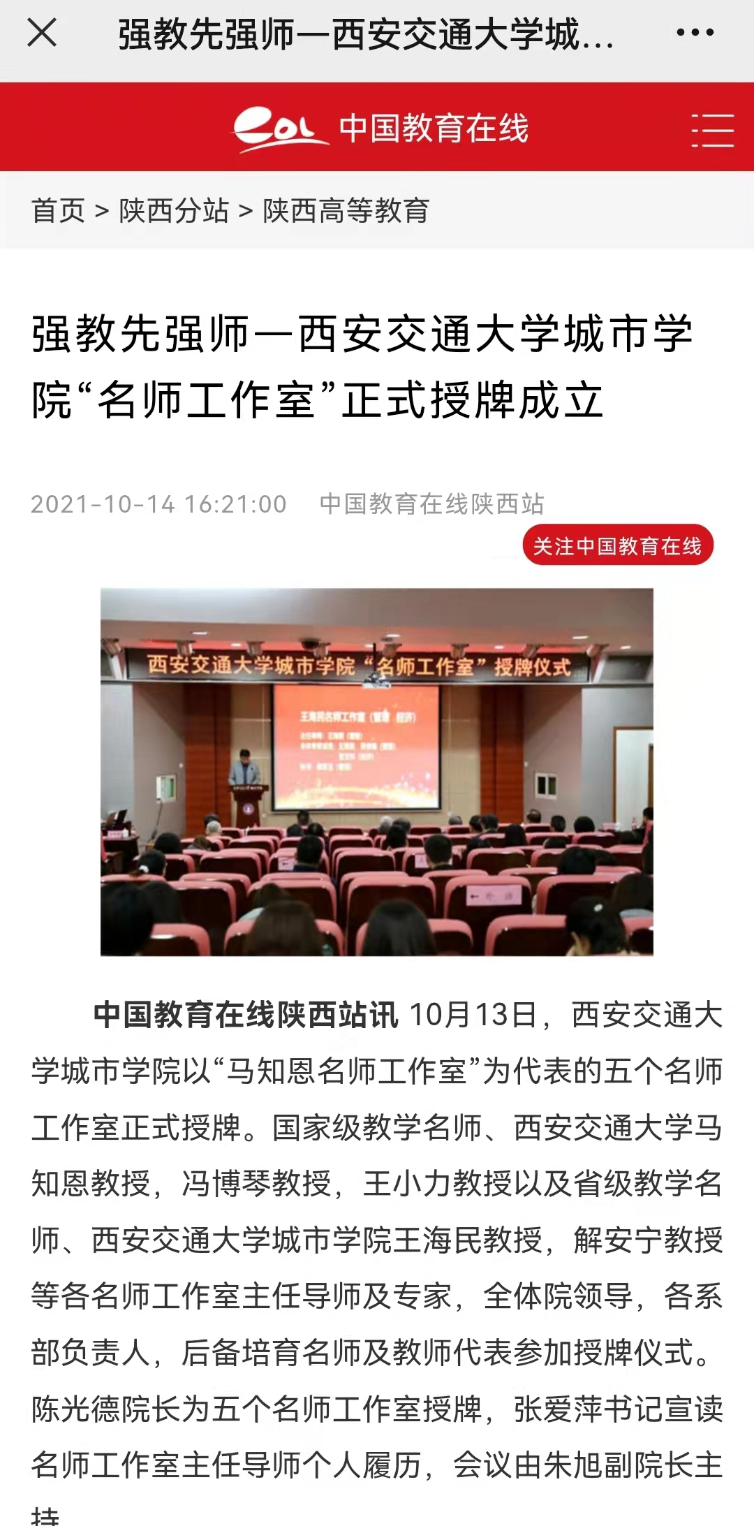 近日,中国教育在线报道了学院“名师工作室”授牌成立情况。具体内容及链接如下: