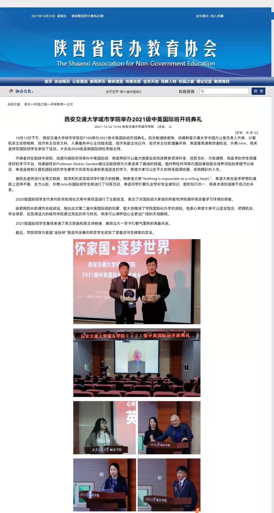 近日,陕西省民办教育协会报道了学院2021级中英国际班开班典礼情况。具体链接及内容如下: