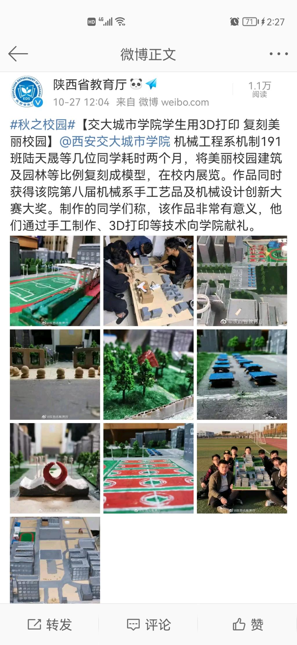 10月27日,陕西省教育厅官方微博报道了学院学生用3D打印 复刻美丽校园相关内容。具体链接及内容如下: