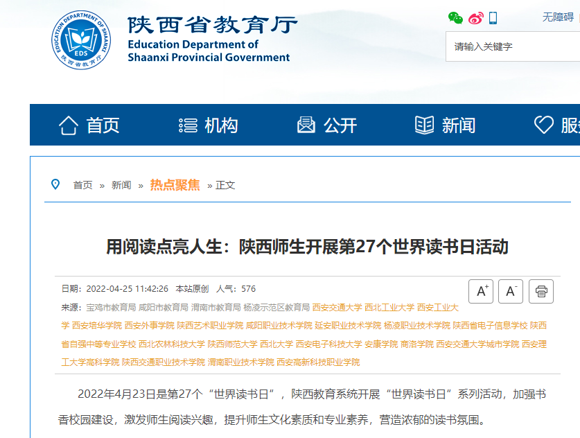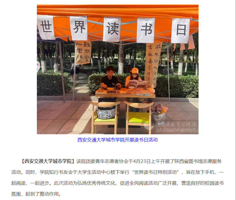 链接:用阅读点亮人生:陕西师生开展第27个世界读书日活动_热点聚焦_新闻_陕西省教育厅 (shaanxi.gov.cn)