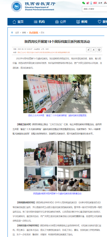 近日,陕西省教育厅报道了学院开展国际档案日系列教育活动,具体链接及内容如下: