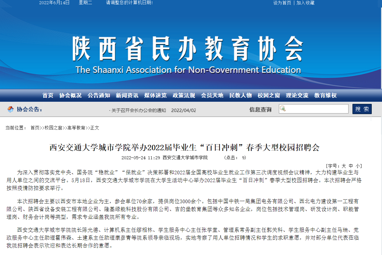 近日,陕西省民办教育协会报道了学院举办2022届毕业生“百日冲刺”春季大型校园招聘会情况,具体链接及内容如下: