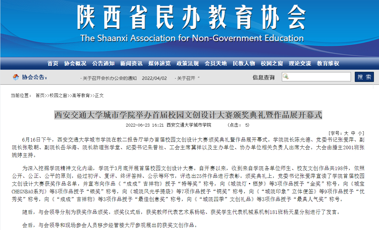近日,陕西省民办教育协会报道了学院首届文创设计大赛暨作品展开幕式情况。具体链接及内容如下: